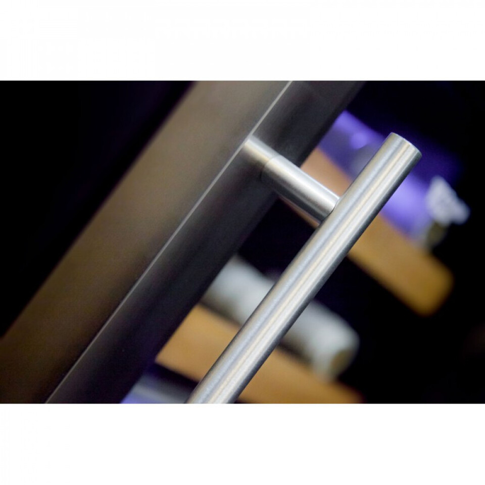 Корпус винного шкафа выполнен из стали, окрашенной в чёрный цвет.Особый стиль шкафу придаёт прочная стальная рама по периметру стеклянной дверцы, и такого же цвета разделительная панель внутри шкафа. На этой панели расположено управление с жк дисплеем. На ней можно установить желаемую температуру в каждой из зон и включить приятную светодиодную подсветку. Винный шкаф открывается с помощью удобной стальной ручки на двери. В линейке термоэлектрических шкафов Cold Vine есть аналогичная по вместительности и габаритам модель C12-TBF2, отличающаяся внешним дизайном и панелью управления.