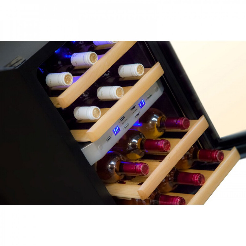 Новый термоэлектрический винный шкаф от бренда Cold Vine- это стильный, компактный и вместительный C12-TSF2. Внутреннее пространство шкафа разделено на две отдельные температурные зоны, что позволяют хранить одновременно как и белые, так и красные вина. Полки шкафа деревянные, предназначенные для хранения 12 бутылок типа Бордо. А также на полках легко помещаются бутылки шампанского. При необходимости можно вытащить одну из полок,и расположить более объемные бутылки.