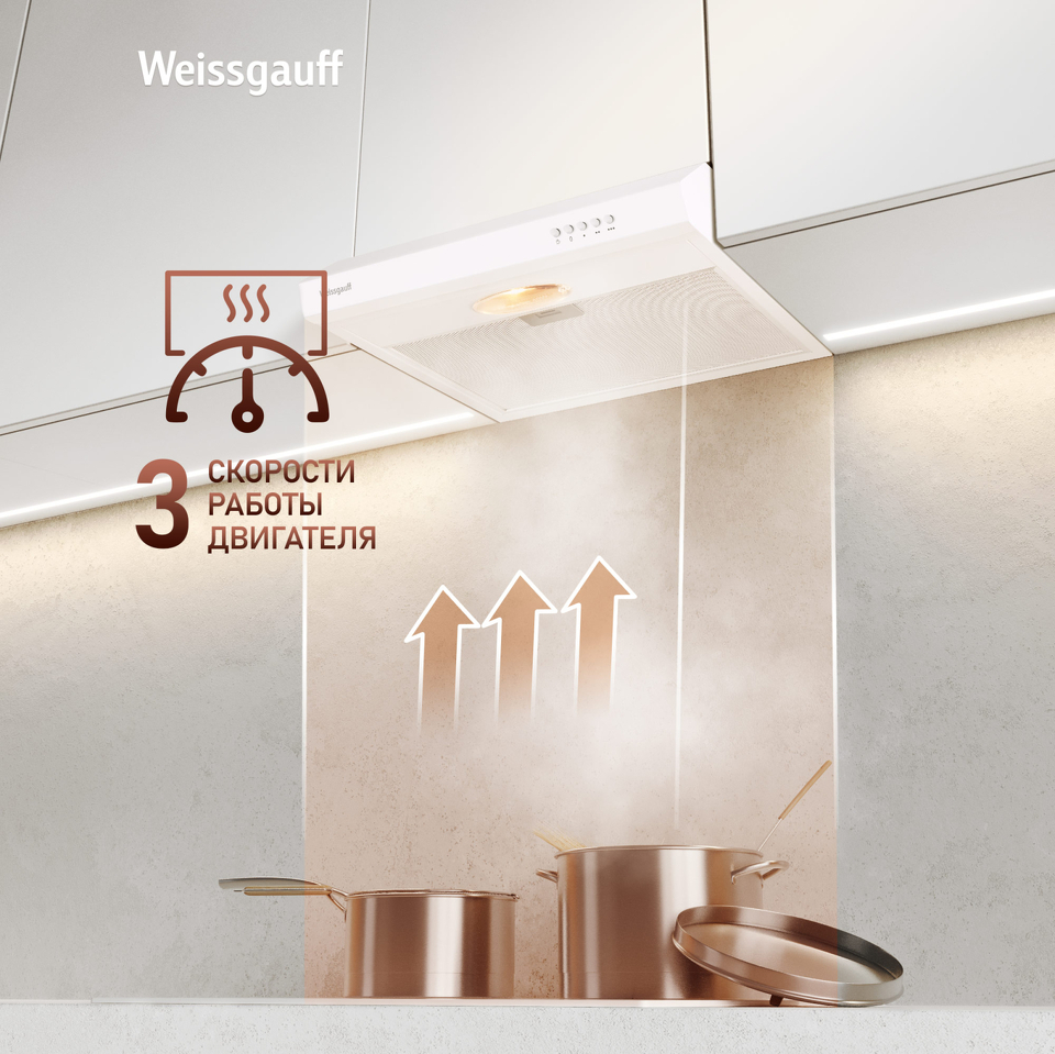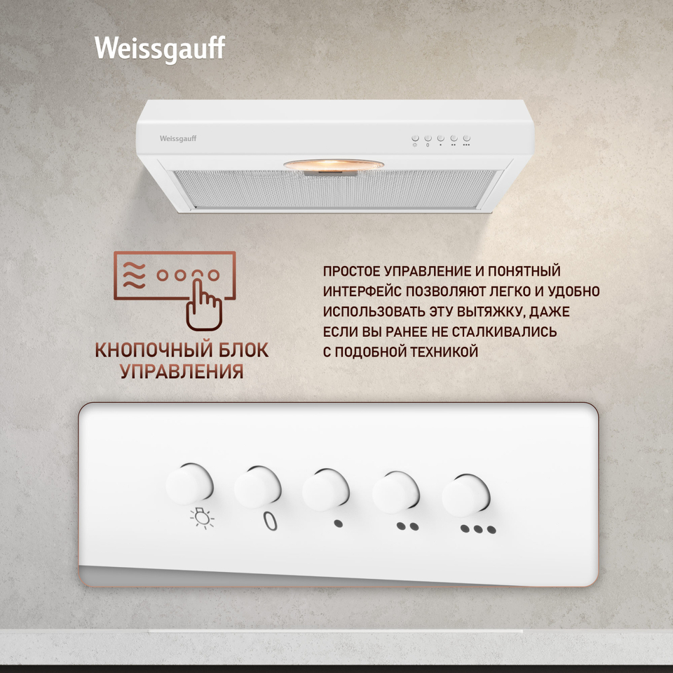 Плоская кухонная вытяжка от Weissgauff, воплощающая в себе безупречный дизайн и высокую эффективность, оснащена интуитивно понятным кнопочным управлением и выполнена в дизайне белого цвета!