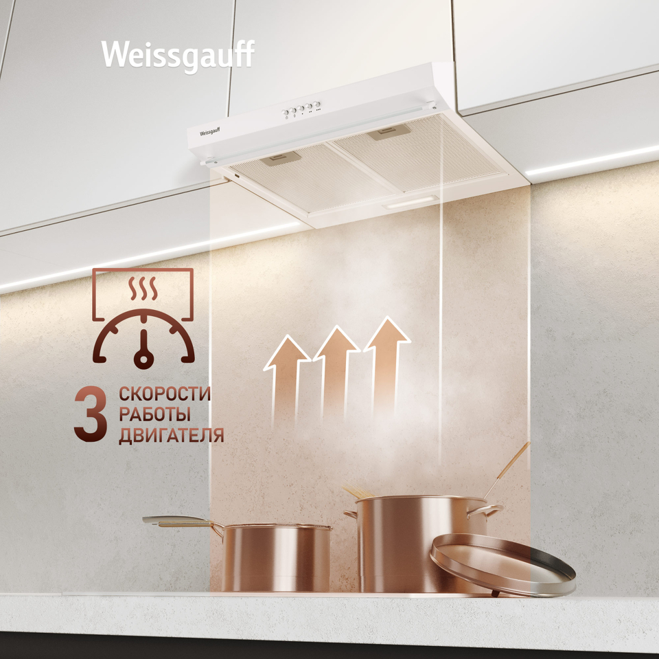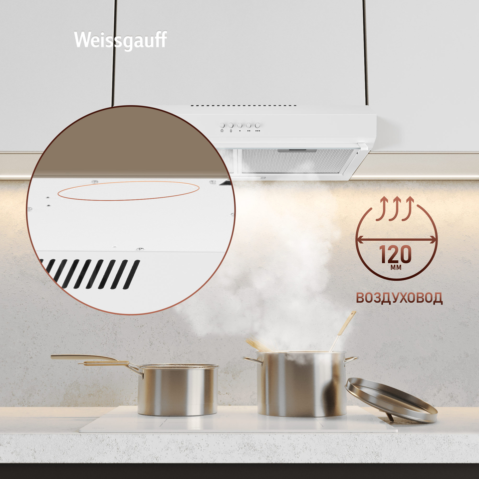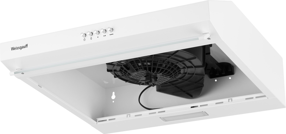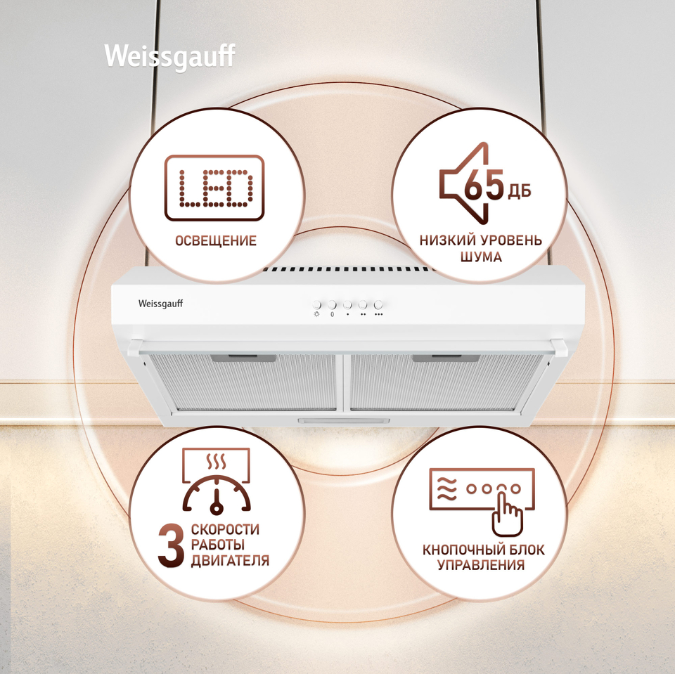 Плоская кухонная вытяжка от Weissgauff, воплощающая в себе безупречный дизайн и высокую эффективность, оснащена интуитивно понятным кнопочным управлением и выполнена в дизайне белого цвета!