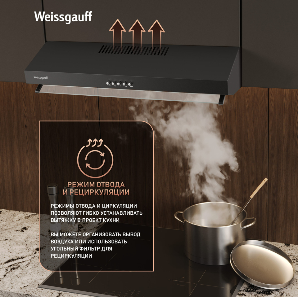 • Работа в режимах отвода и циркуляции откроет вам широкие возможности по установке этой вытяжки в проект вашей кухни. Организуйте полноценный вывод воздуха из помещения или установите угольный фильтр и используйте вытяжку вместе с ним - какой бы вариант вы ни выбрали, модель от Weissgauff сделает это возможным!