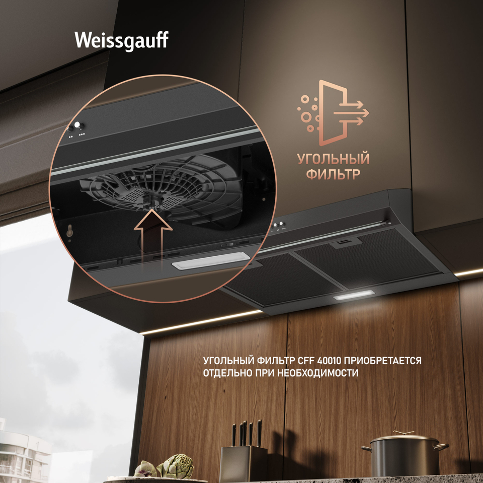 Плоская кухонная вытяжка от Weissgauff, воплощающая в себе безупречный дизайн и высокую эффективность, оснащена интуитивно понятным кнопочным управлением и выполнена в дизайне черного цвета!