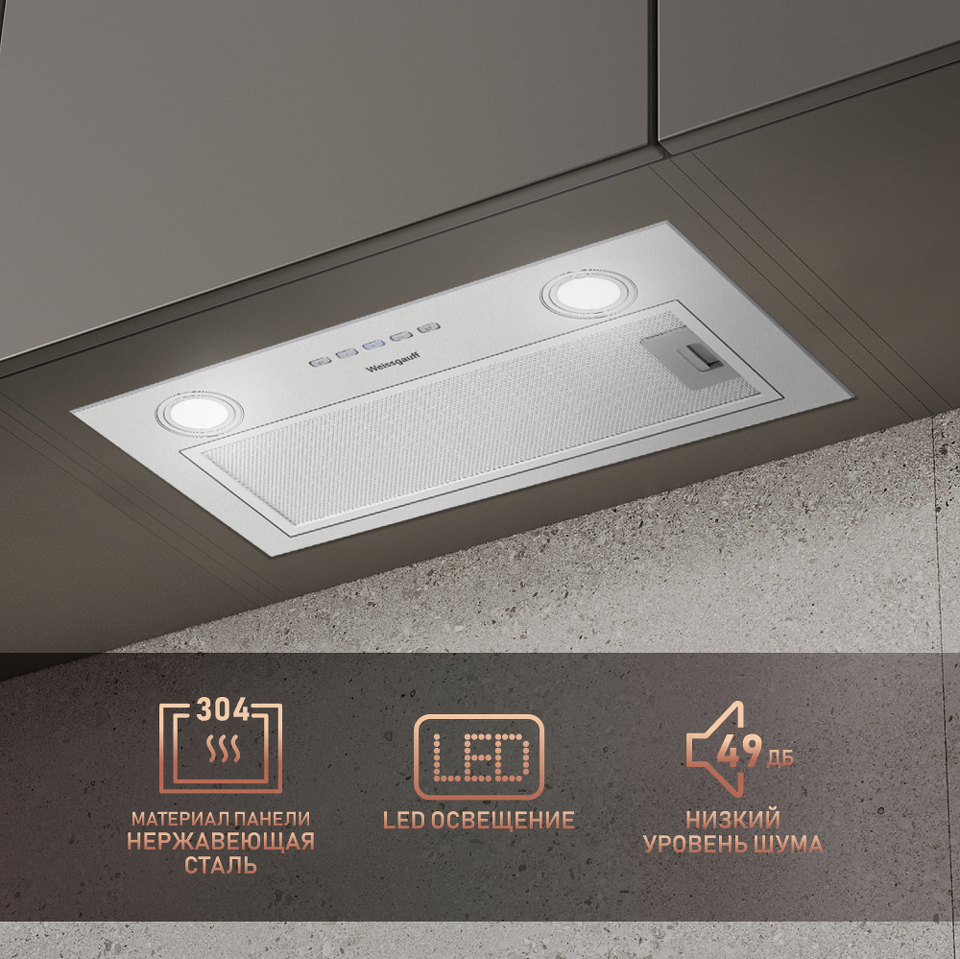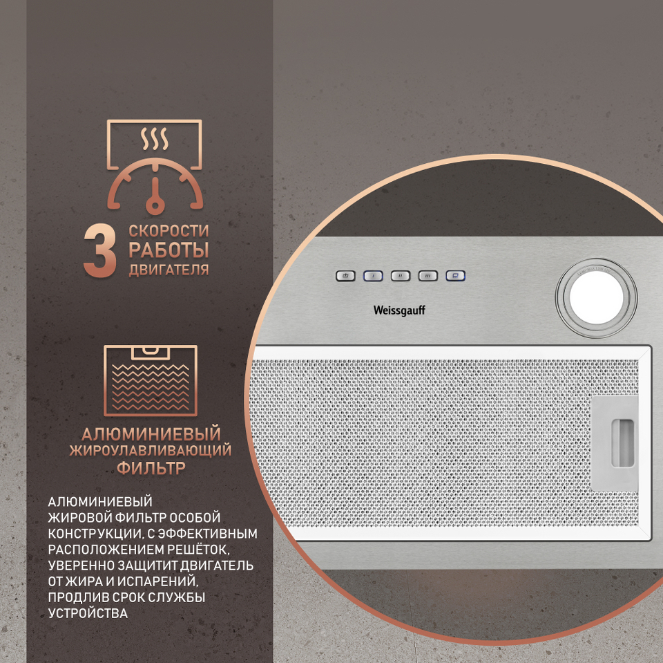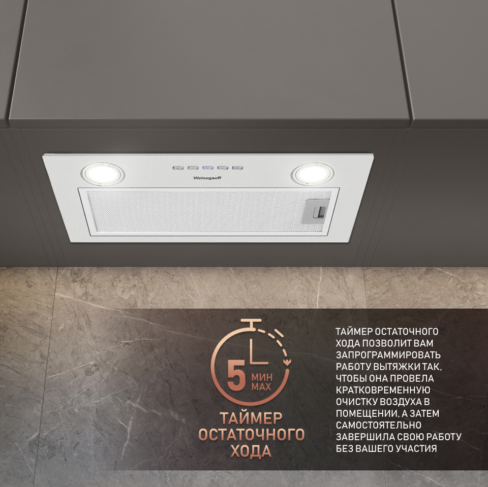 Поистине мощная вытяжка от Weissgauff, обладающая ураганной производительностью в 850 м3/ч, выполненная в дизайне врезного блока, справится со своей задачей даже на самой большой кухне!