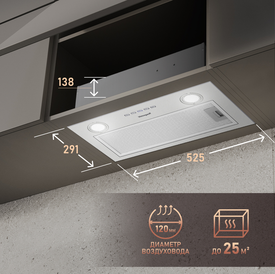 Эффективная работа в помещении площадью до 25 м2 - это гарантия того, что после установки вытяжки Weissgauff, обновление воздуха будет соответствовать всем требуемым нормам, сохраняя ваше здоровье на долгие годы!