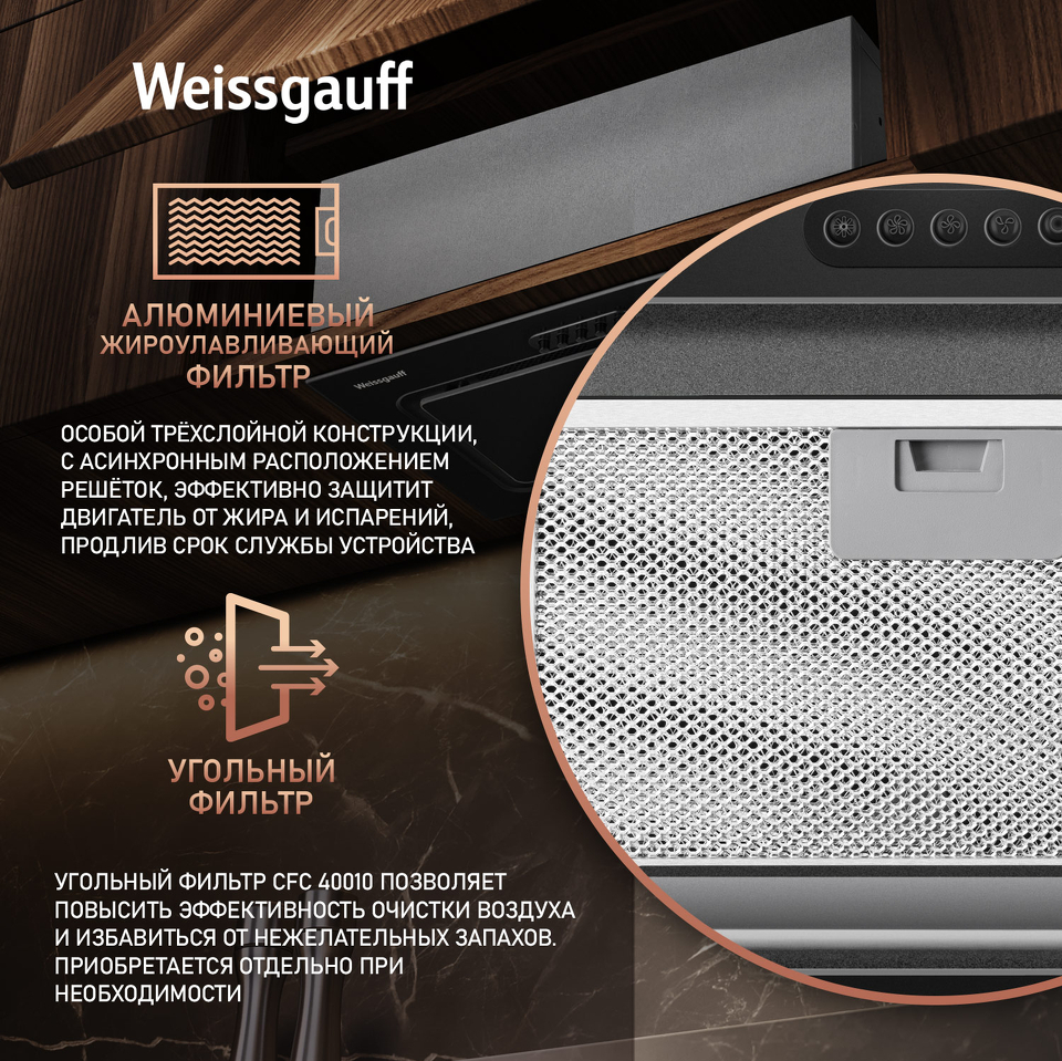 Эффективная работа в помещении площадью до 27 м2 - это гарантия того, что после установки вытяжки Weissgauff, обновление воздуха будет соответствовать всем требуемым нормам, сохраняя ваше здоровье на долгие годы!