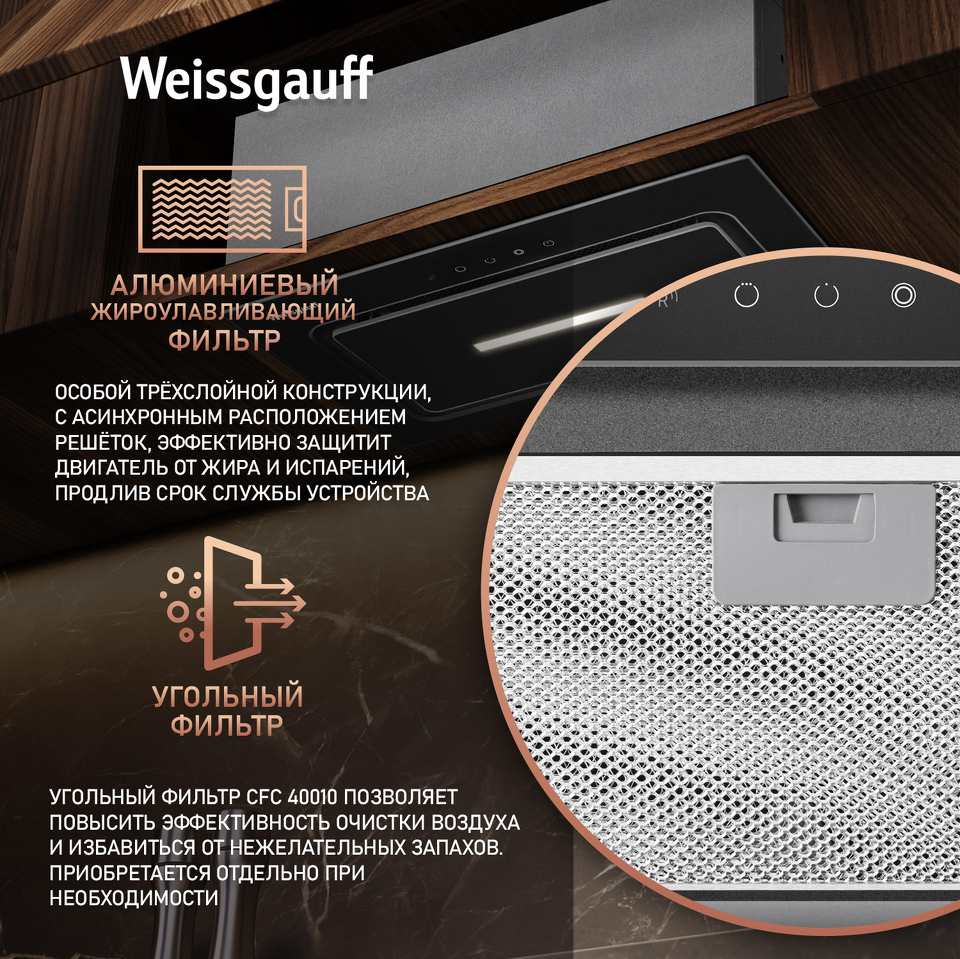 Полностью встраиваемая вытяжка от Weissgauff, воплощающая в себе безупречный дизайн и высокую эффективность, оснащена интуитивно понятным сенсорным управлением и выполнена в дизайне врезного блока с панелью стильного черного цвета!