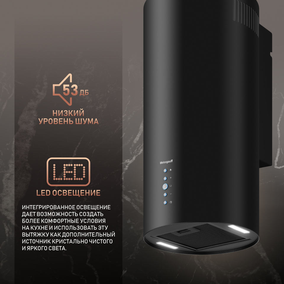 Эффективная работа в помещении площадью до 27 м2 - это гарантия того, что после установки вытяжки Weissgauff, обновление воздуха будет соответствовать всем требуемым нормам, сохраняя ваше здоровье на долгие годы!
