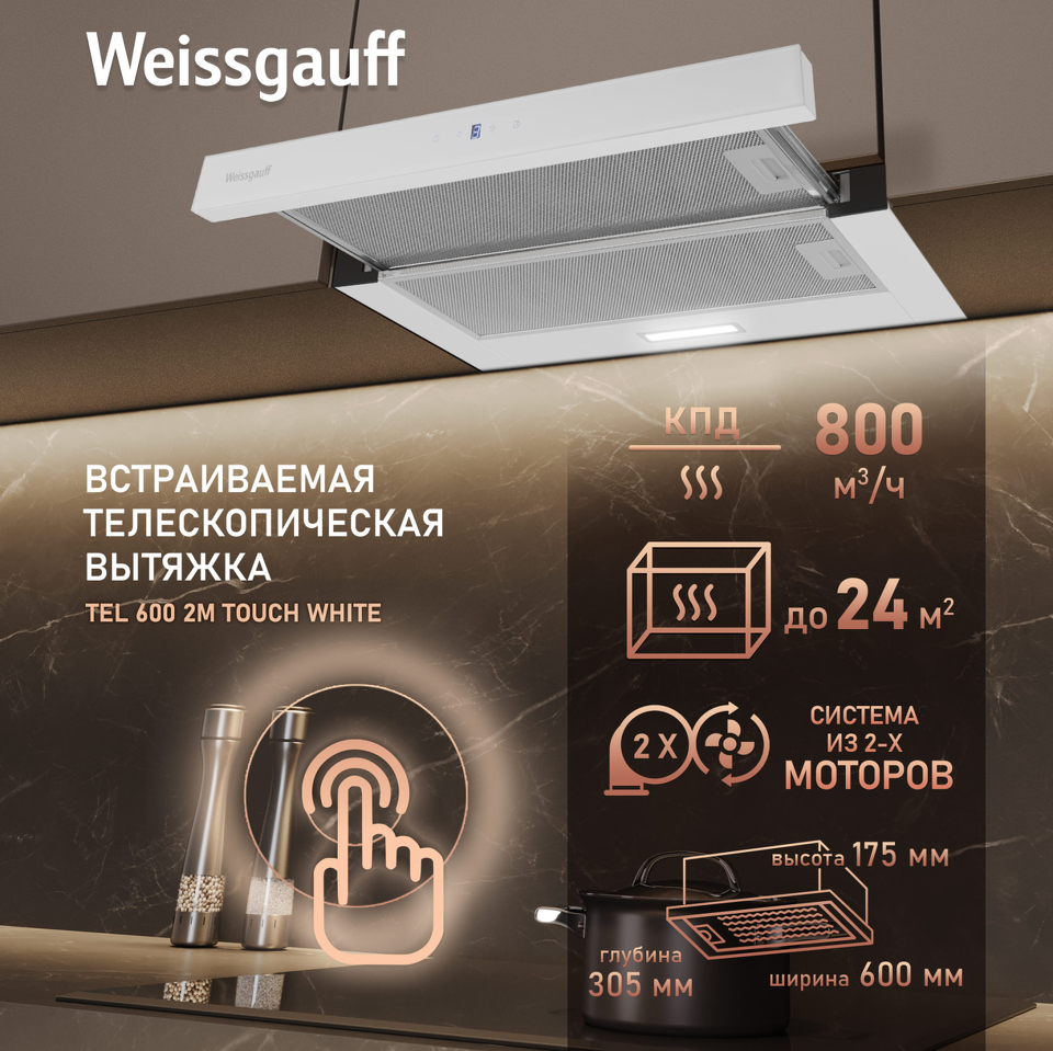 • Эффективная система из двух моторов делает данное устройство самой производительной вытяжкой в линейке телескопических моделей Weissgauff!