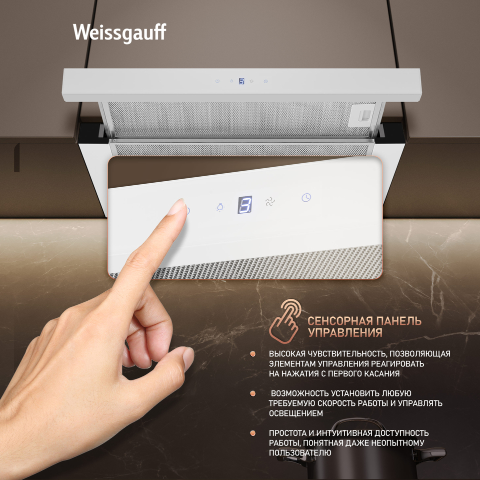 Встраиваемая в верхний подвесной шкаф двухмоторная телескопическая вытяжка оснащенная сенсорной панелью управления Touch Control, разработанная компанией Weissgauff, представляет собой инновационное решение в области кухонного оборудования. Данная модель, отличающаяся высокой производительностью в 800 м³/ч, демонстрирует выдающуюся эффективность в очистке воздуха и поддержании оптимального микроклимата в кухонном пространстве!