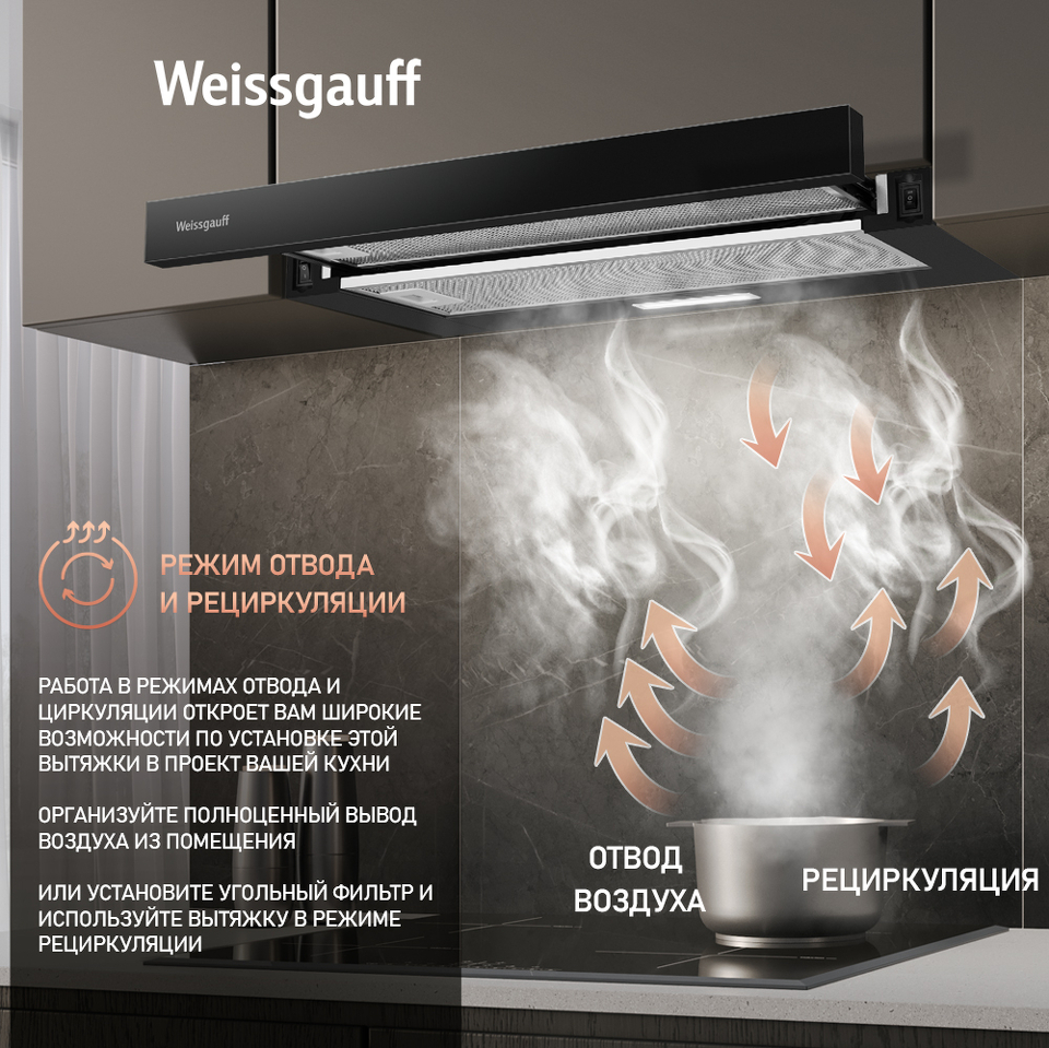 Работа в режимах отвода и циркуляции откроет вам широкие возможности по установке этой вытяжки в проект вашей кухни. Организуйте полноценный вывод воздуха из помещения или установите угольный фильтр и используйте вытяжку вместе с ним - какой бы вариант вы ни выбрали, модель от Weissgauff сделает это возможным!