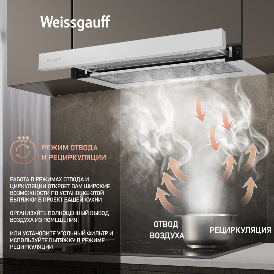 Работа в режимах отвода и циркуляции откроет вам широкие возможности по установке этой вытяжки в проект вашей кухни. Организуйте полноценный вывод воздуха из помещения или установите угольный фильтр и используйте вытяжку вместе с ним - какой бы вариант вы ни выбрали, модель от Weissgauff сделает это возможным!
