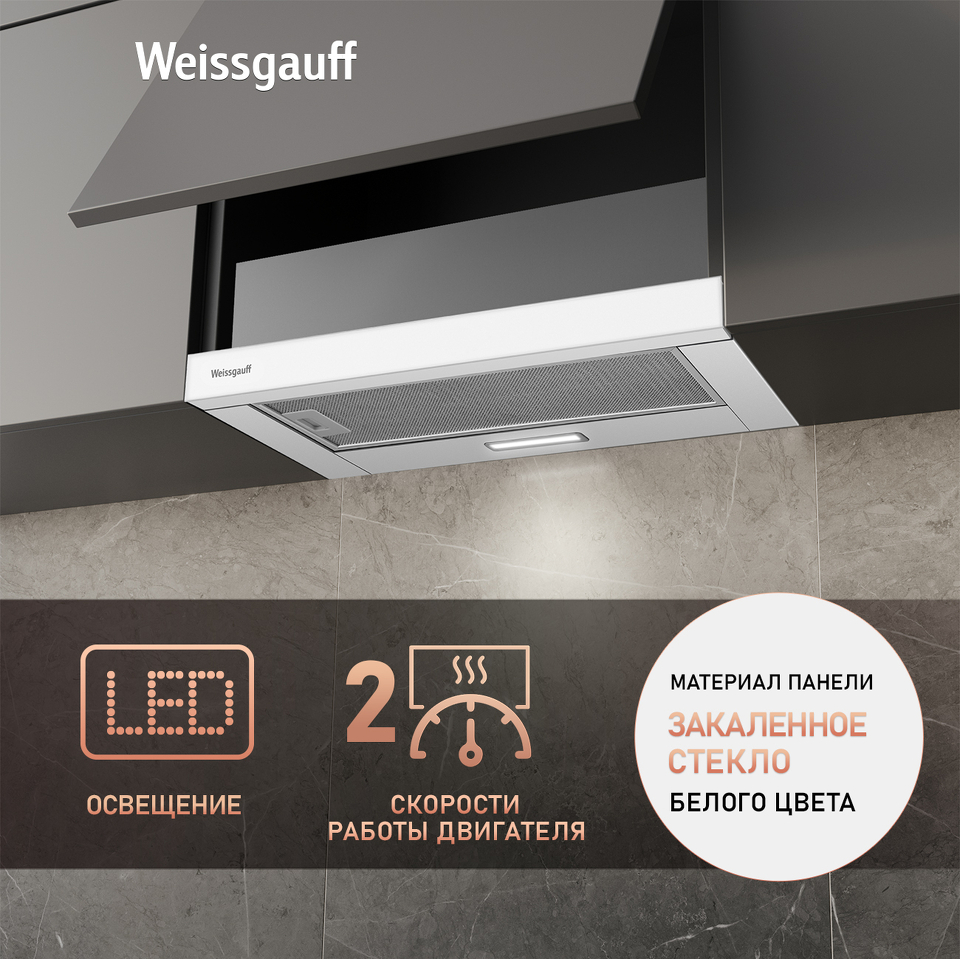 Встраиваемая в верхний подвесной шкаф телескопическая вытяжка от Weissgauff, обладающая впечатляющей производительностью 600 м3/ч и низким уровнем шума 46 дБ, выполненная в белом цвете, не только порадует своей функциональностью, но и станет настоящим украшением вашей кухни!