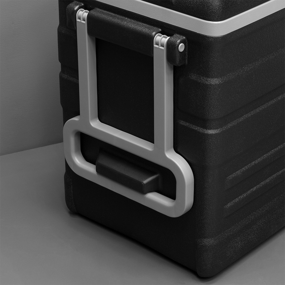 Автохолодильник имеет ручку и колёса для удобного перемещения.