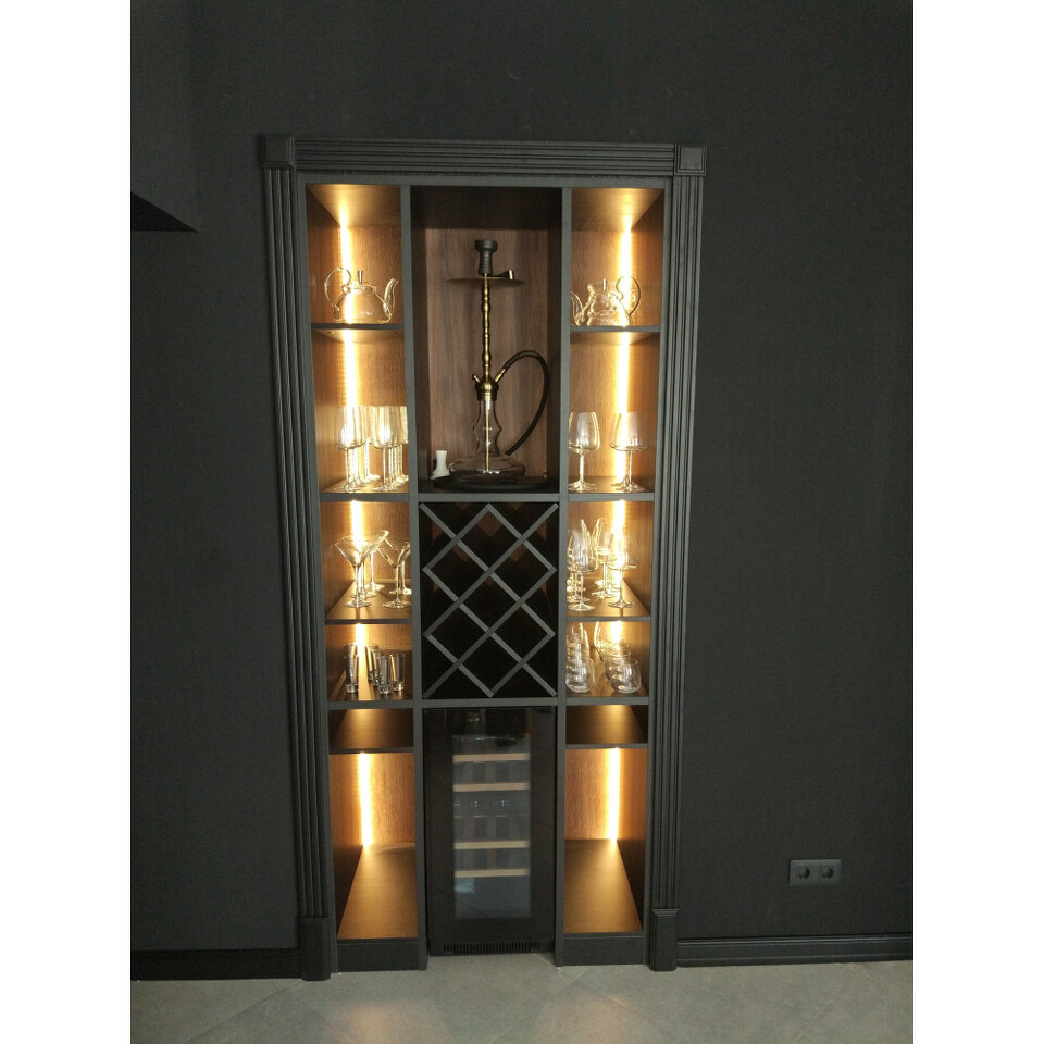 Дверца шкафа выполнена из тонированного стекла с защитой от УФ лучей в рамке черного цвета.