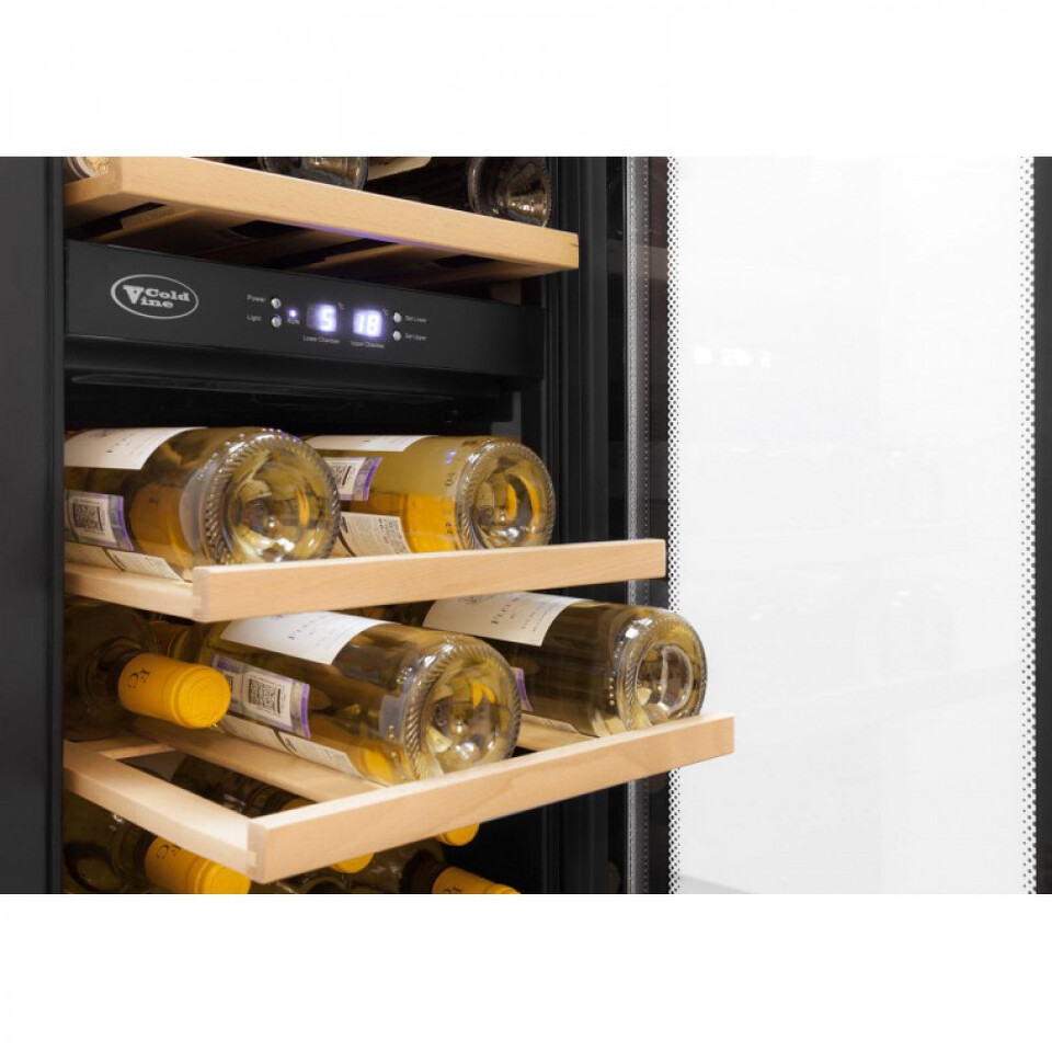 Регулируемый температурный режим в диапазоне от от +10°C до +18°Cв верхней зоне, и от +5°C до +10°C в нижней зоне, -позволяет хранитьотдельно белые, красные и игристые вина