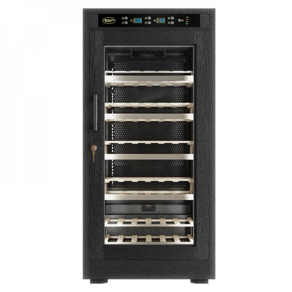 Классический винный шкаф Cold Vine C66-WB1 (Modern) является стильным дополнением к вашему дому и прекрасным помощником в вопросе хранения вина. Объем данного шкафа составляет 200 литров, а это означает, что вы с легкостью можете разместить внутри него до 66 бутылок вина типа Бордо объемом по 0, 75 литра. Данная модель является отдельностоящей, а это означает что у вас появится не просто многофункциональный помощник, но также и стильное дополнение к вашему интерьеру. Данный винный шкаф не подразумевает разделения на зоны, соответственно, вы можете разместить в нем вина только одного типа. Температурный режим может быть выставлен любой в диапазоне от +5 до +22 ˚С. Уникальная опция линейки данных шкафов - наличие цифрового контроля влажности. Тип охлаждения - компрессорный. Корпус данного винного шкафа выполнен из натурального дерева черного цвета (шпон дуба). В базовой комплектации имеются деревянные выкатные полки в количестве 5 штук.