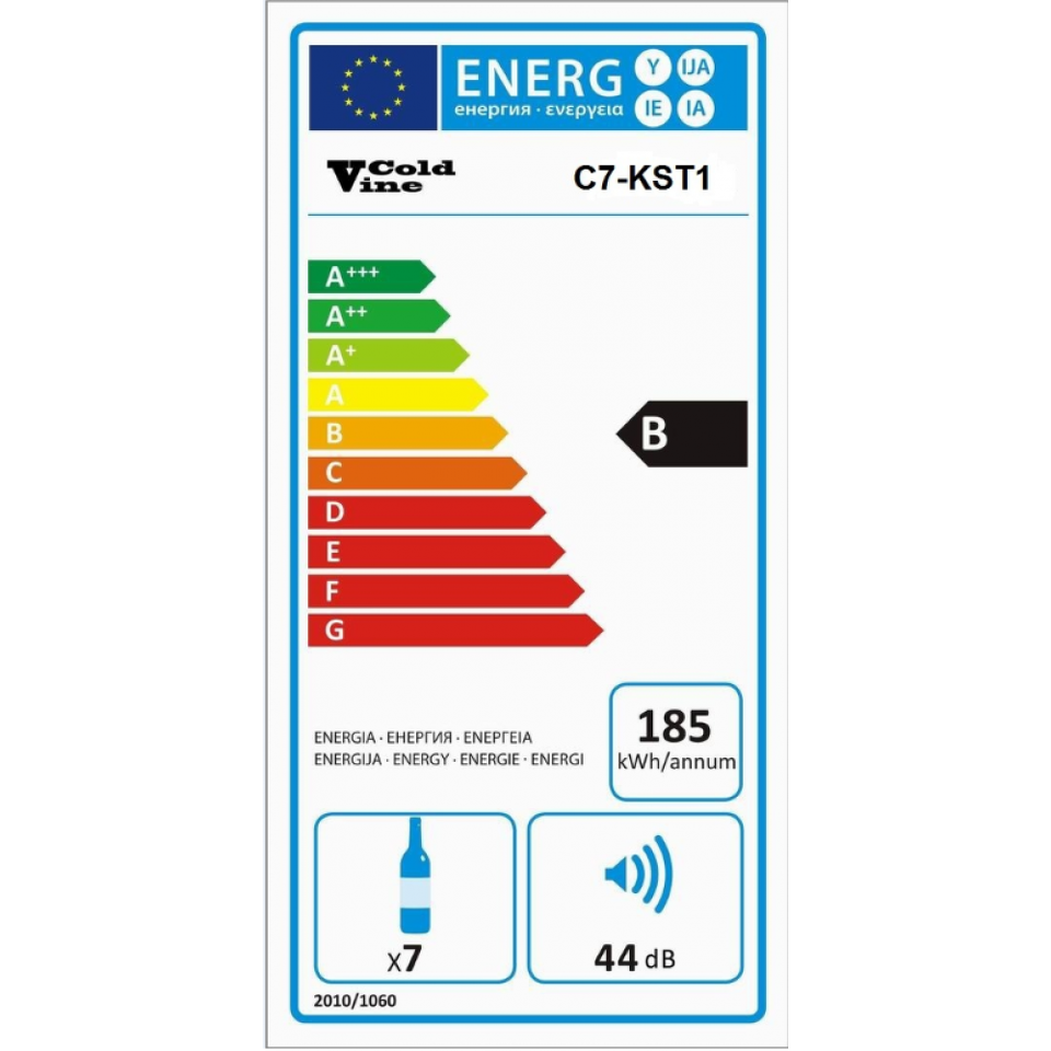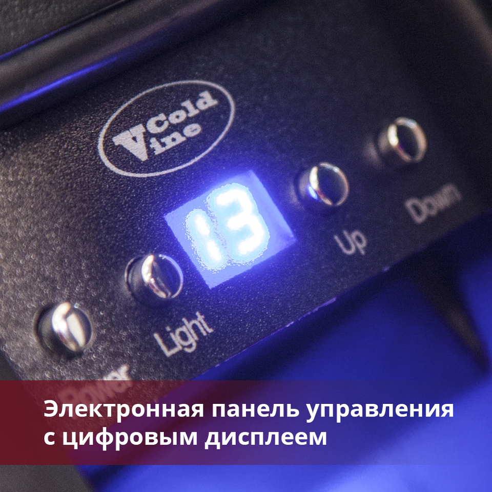 Компактный и лаконичный винный шкаф Cold Vine C7-KST1 вмещает в себя 7 бутылок вина типа бордо. Модель оснащена внутренним вентилятором для равномерного доступа холодного воздуха ко всем полкам шкафа и внешним вентилятором для быстрого и эффективного охлаждения компрессора. Комплектуется холодильник C7-KST1 шестью полками из пластифицированного металла. Надежная фиксация полок исключает возможность малейших вибраций и колебаний внутри шкафа. В верхней части шкафа находится интуитивно-понятная электронная панель управления, с легкостью регулируйте температуру и освещение внутри шкафа.
