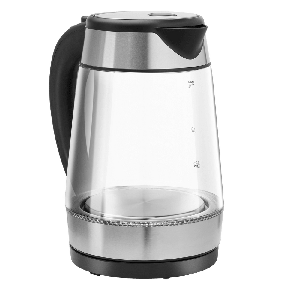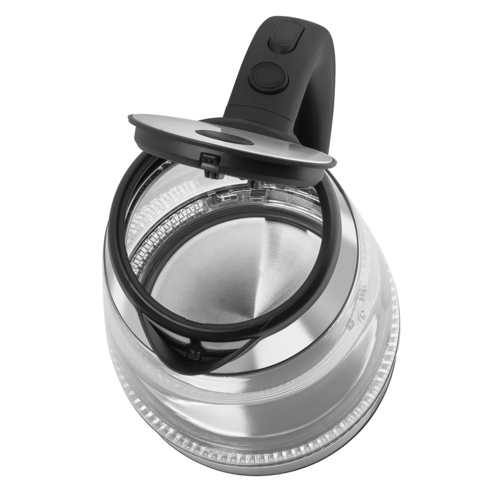 Элегантный чайник мощностью 2 200 Вт и объемом 1,7 л представляет собой идеальную комбинацию металлического основания и колбы из жаропрочного боросиликатного стекла, которая легко моется.
