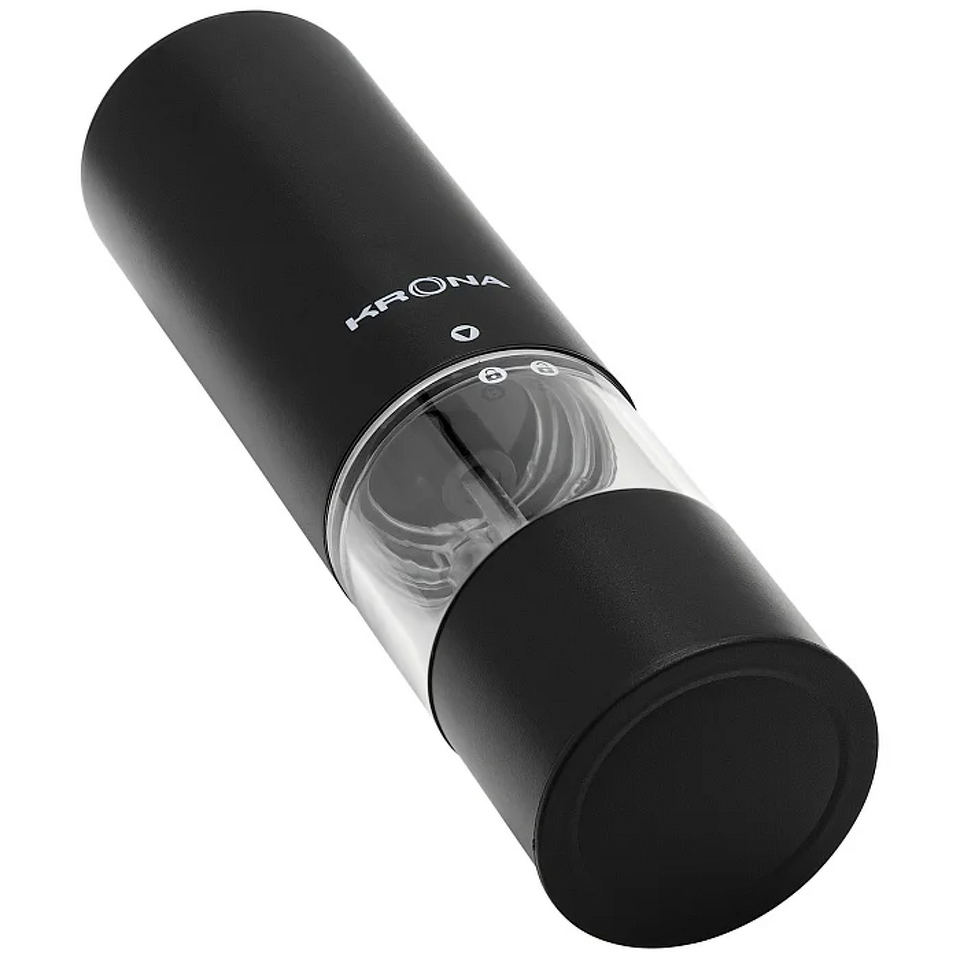 Электрический измельчитель KRONA Salz Pfeffer Klein Black — идеальное сочетание стиля и функциональности для вашей кухни. Этот универсальный измельчитель с легкостью справится с солью, перцем, крупными специями и даже сушеными травами. Все что нужно — это нажать кнопку, и мельница мгновенно сделает свою работу, обеспечивая быстрый и равномерный помол. Этому способствуют надежные керамические жернова и плавная регулировка степени помола — от мелкого до крупного, чтобы раскрыть максимум вкуса и аромата специй в любом блюде. Встроенная подсветка сделает использование устройства особенно удобным, позволяя точно дозировать количество специй даже при слабом освещении. Прочный металлический корпус в элегантном черном цвете не только выглядит стильно, но и обеспечивает длительный срок службы. Компактный размер устройства позволяет легко найти для него место на кухонной полке или столе. Съемный контейнер объемом 70 мл легко наполнить, а благодаря подставке-заглушке измельчитель удобно хранить, не боясь, что специи случайно просыпятся.
