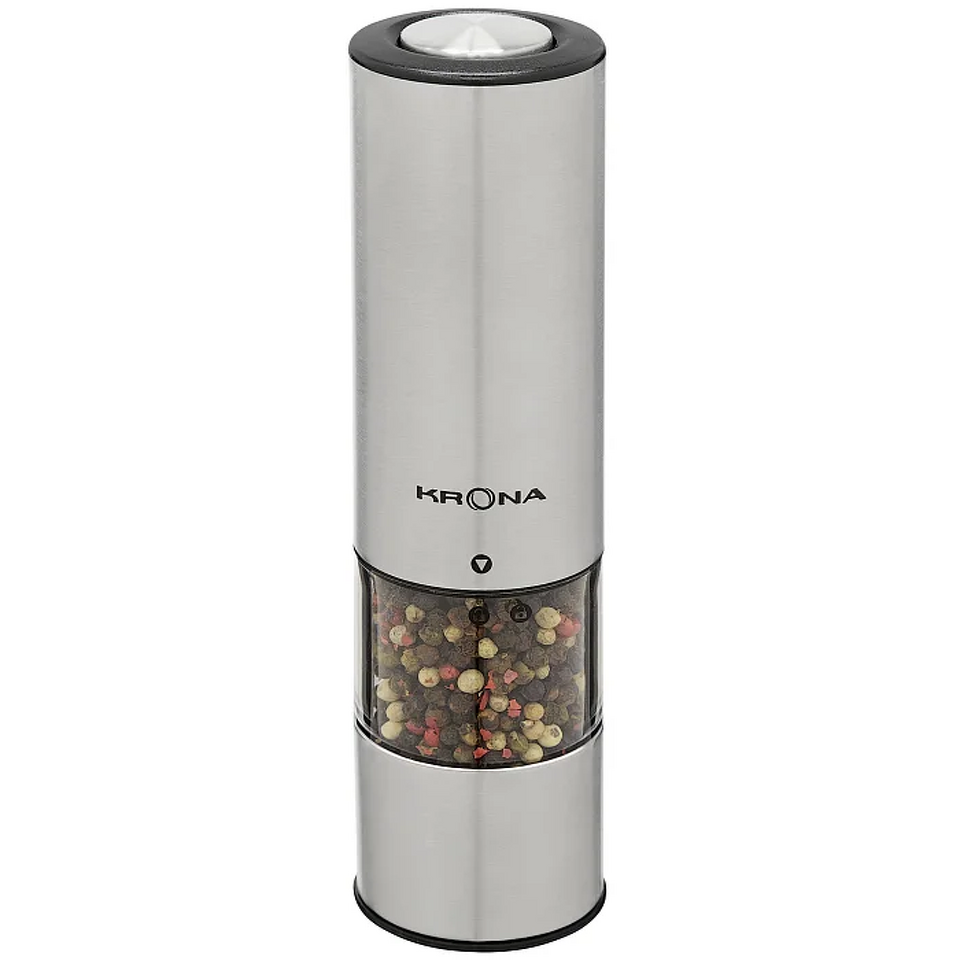 Электрический измельчитель для специй KRONA Salz Pfeffer Klein Inox — удобный и стильный аксессуар для кухни, который сочетает функциональность и элегантный дизайн. Универсальная модель подходит для измельчения соли, перца и большинства популярных специй и трав. Керамические жернова и плавная регулировка степени помола позволяют выбрать идеальную текстуру для разных задач и типов блюд. Управление максимально простое — всего одна кнопка, а встроенная подсветка делает процесс еще удобнее. Прочный матовый корпус выглядит стильно и надежно, при этом устройство имеет компактные размеры и не займет много места. Съемный контейнер объемом 70 мл (до 33 г специй) легко наполнять и очищать. В комплект входит подставка-заглушка для аккуратного хранения. Измельчитель работает от 6 батареек AAA (приобретаются отдельно) и поставляется в индивидуальной цветной упаковке — отличное решение как для личного использования, так и в качестве подарка.