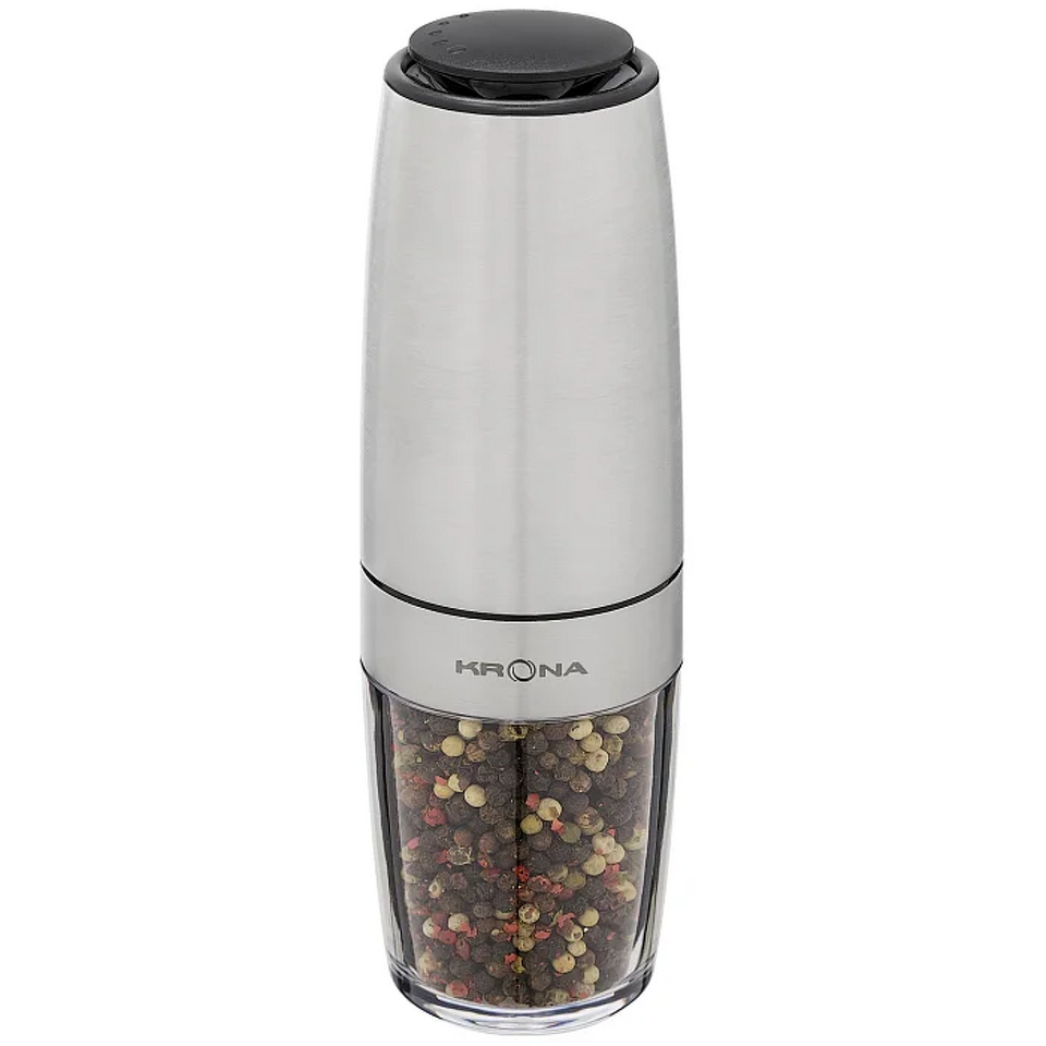 Электрический измельчитель KRONA Salz Pfeffer Schwerkraft Inox — функциональный помощник для легкого и быстрого измельчения соли, а также большинства специй и трав. Благодаря технологичной системе гравитационного управления достаточно повернуть измельчитель на 90 градусов — и он автоматически начнет работу. Прочные керамические жернова гарантируют длительный срок службы и безупречное измельчение. Плавная регулировка степени помола позволяет настроить прибор под ваши предпочтения. Матовый металлический корпус не только привлекает внимание своим современным видом, но и отличается высокой прочностью. Съемный вместительный контейнер объемом 120 мл (68 г) удобен для хранения специй. Устройство работает от 6 батареек типа ААА и поставляется в индивидуальной цветной упаковке. Сделайте процесс приготовления блюд еще приятнее с KRONA Salz Pfeffer Schwerkraft Inox.
