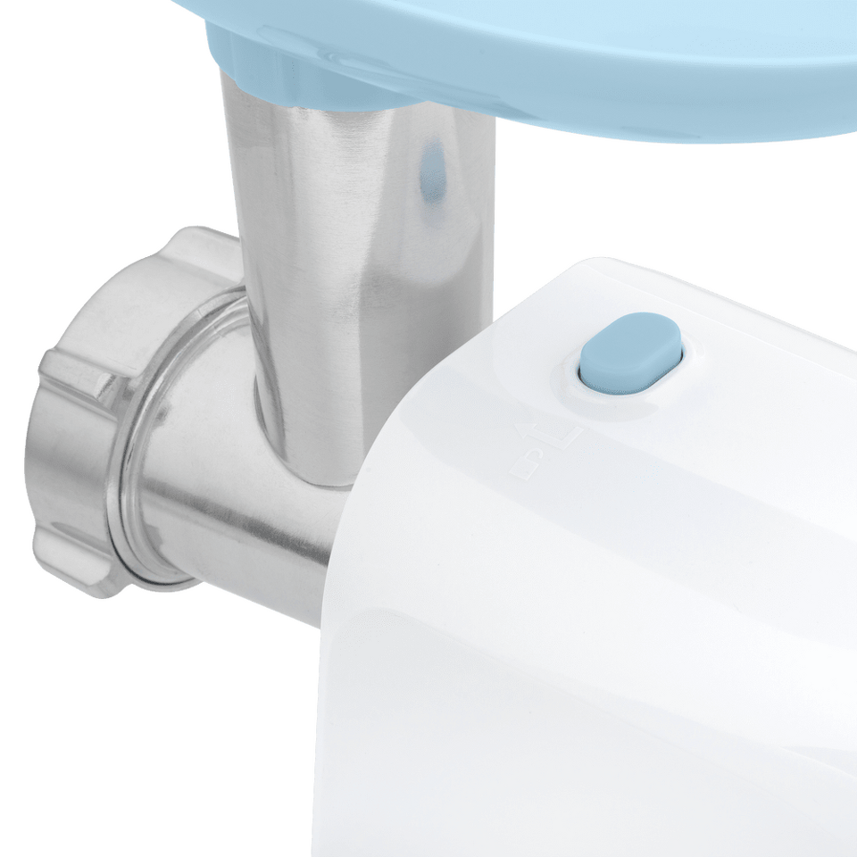 Сама насадка-мясорубка выполнена полностью из металла и укомплектована 4 насадками для различных целей: 2 решетки для изготовления фарша, а также специальные насадки для колбас и кеббе.