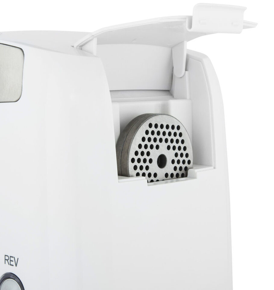 Элегантный белый пластиковый корпус со вставкой цвета металлик - отличительная особенность этой модели. Сама насадка-мясорубка выполнена полностью из металла и укомплектована 3-мя дисками с диаметром отверстий 3, 4.8 и 8 мм, что позволяет получить фарш разной фракции. Диски очень удобно хранить в специальном отсеке в корпусе. Поддон для подачи мяса в мясорубку изготовлен из алюминия. В нижней части находится отсек для хранения сетевого шнура.