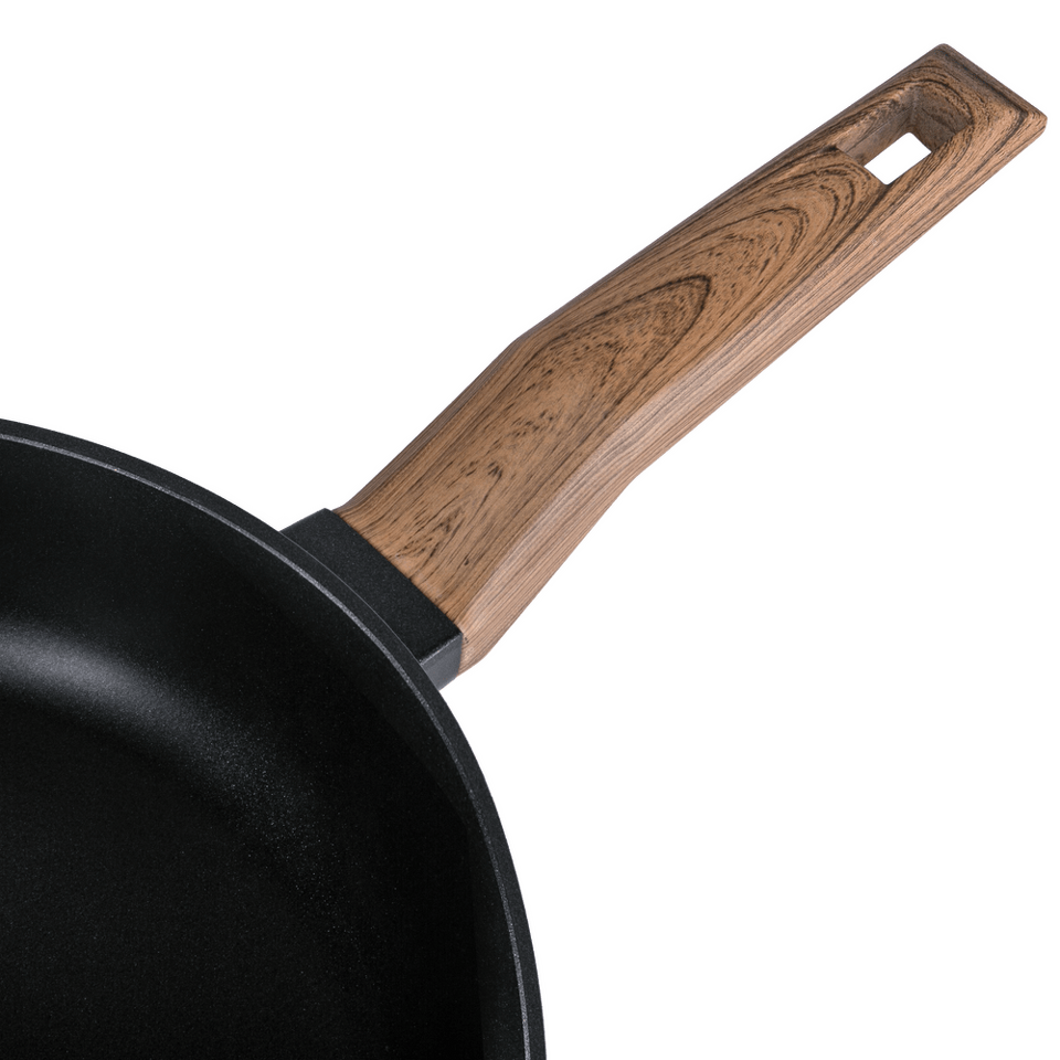 Элегантная сковорода в классическом черном цвете и ручкой из бакелита с отделкой под дерево, подойдет под любой интерьер кухни. Современные и стильные формы- мы учли все мировые тенденции, чтобы посуда была 100% экологичной и стильной.