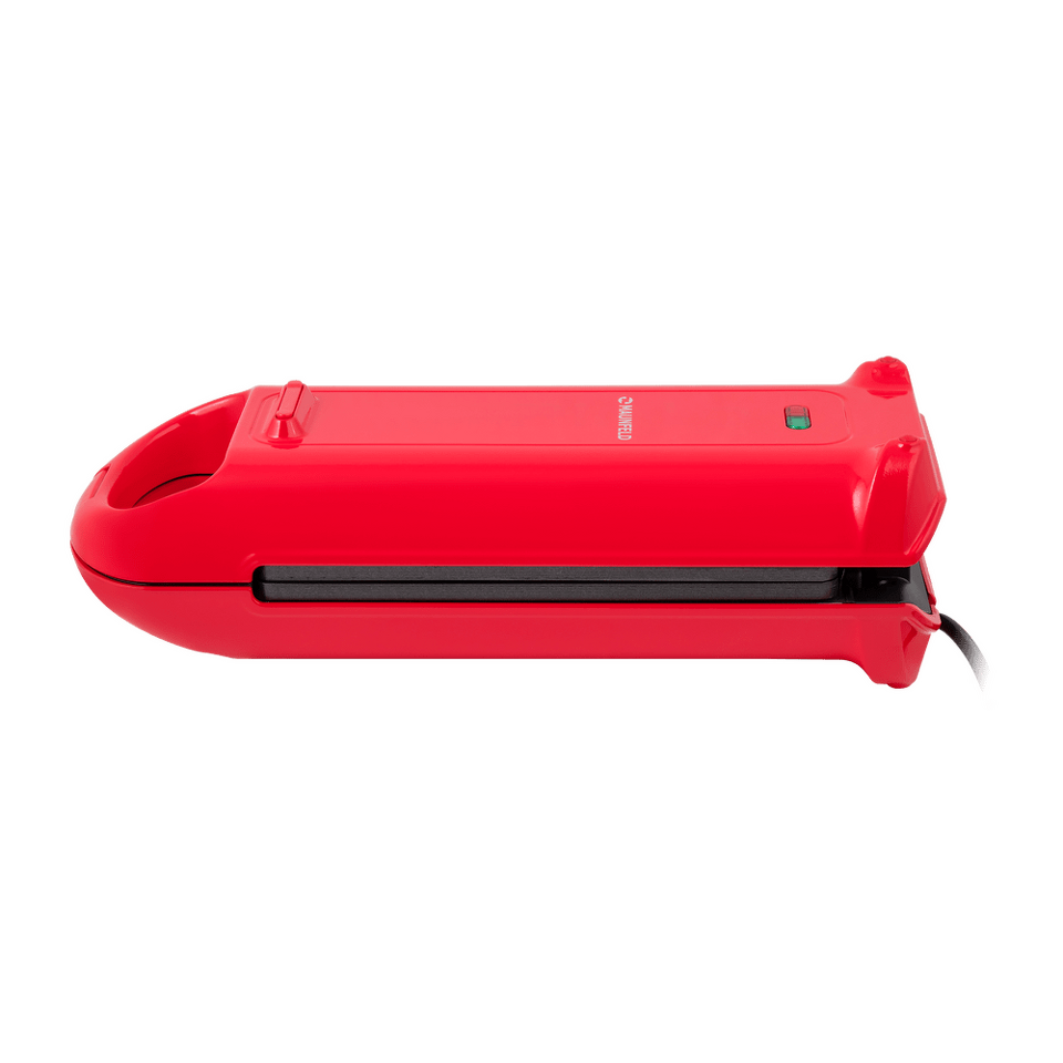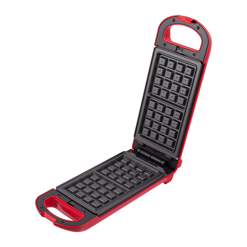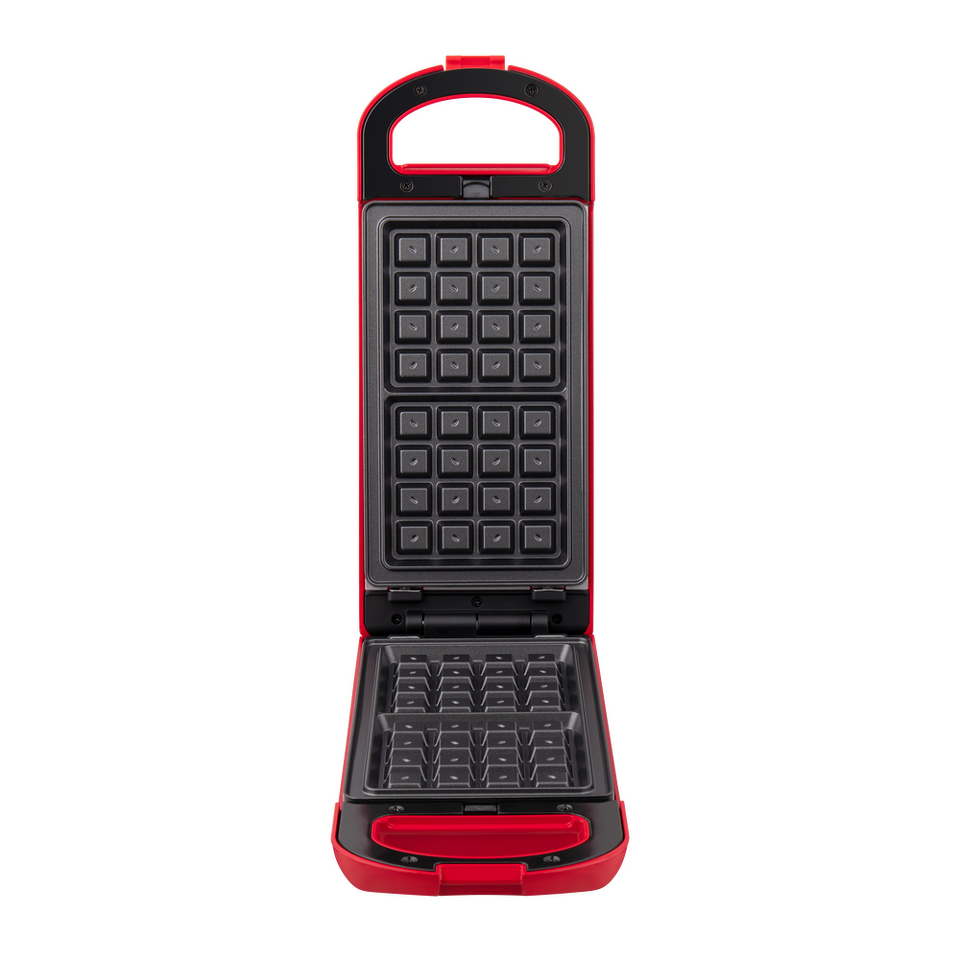 Дизайнерская прямоугольная вафельница мощностью 700 Вт, сделанная из термостойкой пластмассы яркого алого цвета, позволит за 5 минут приготовить две аппетитнейшие венские вафли размером 10х10.