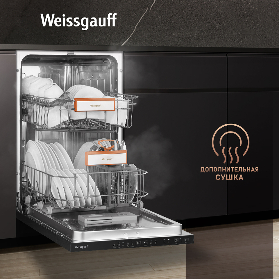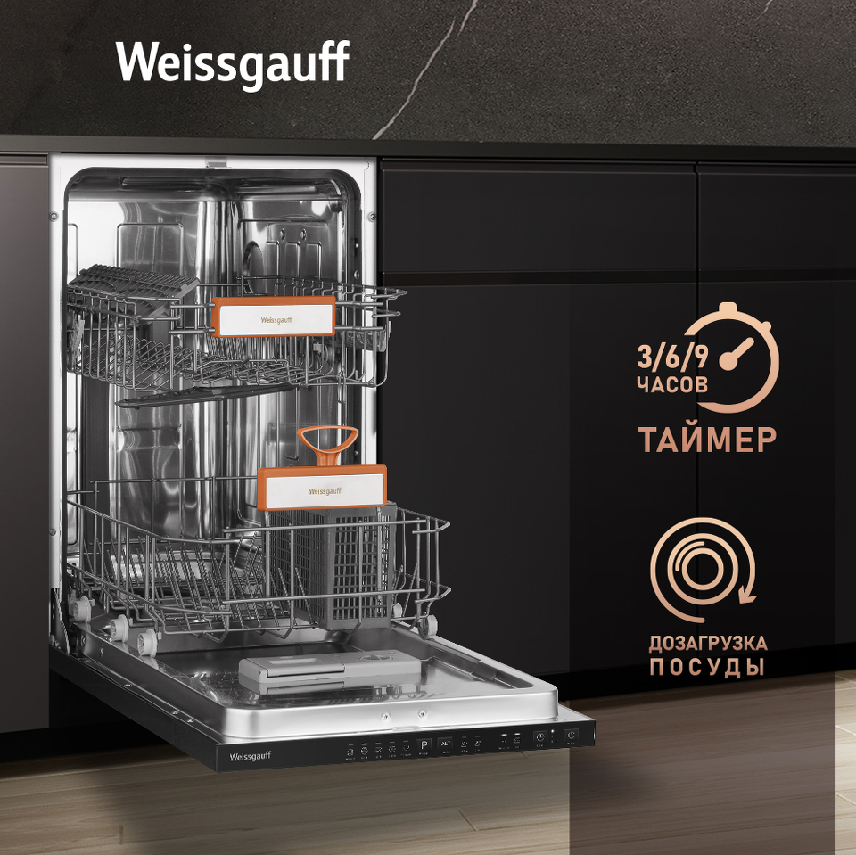 До 9 комплектов посуды одновременно вы можете расположить в данной посудомоечной машине, благодаря современным продуманным и эргономичным корзинам, которыми Weissgauff оснастили эту модель!