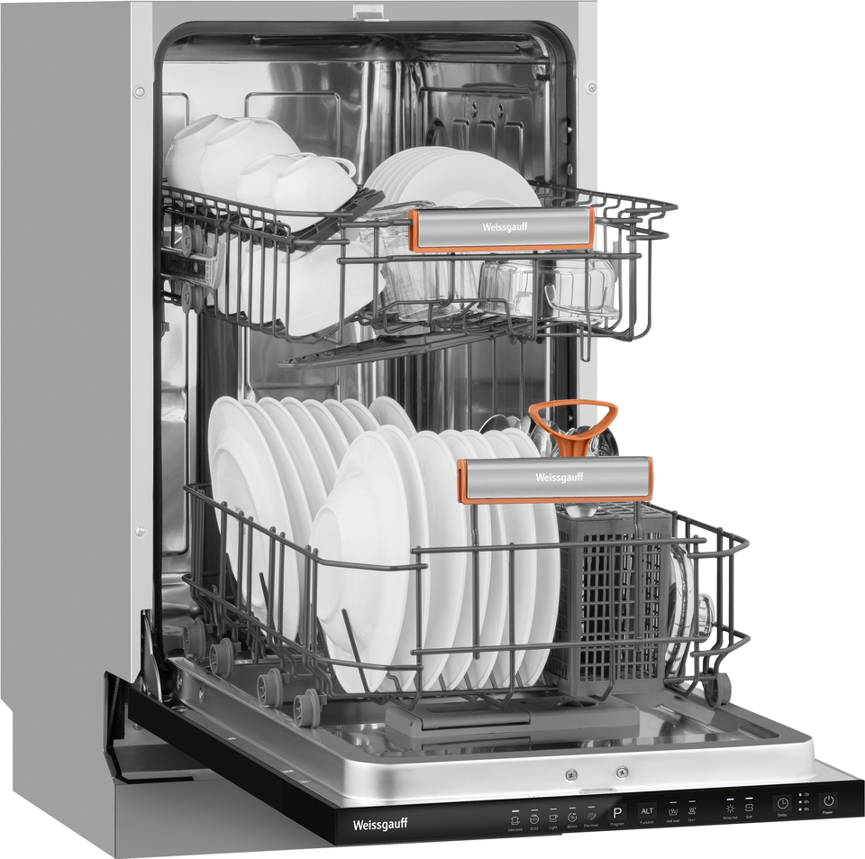 Встраиваемая посудомоечная машина Weissgauff шириной 45 см воплощает в себе один из наших ключевых принципов: достойное качество по разумной цене! Эта модель оснащена двумя функциональными корзинами и обладает вместимостью 9 комплектов посуды. А 5 эффективных программ всегда помогут подобрать оптимальный режим в зависимости от типа посуды и уровня загрязненности.