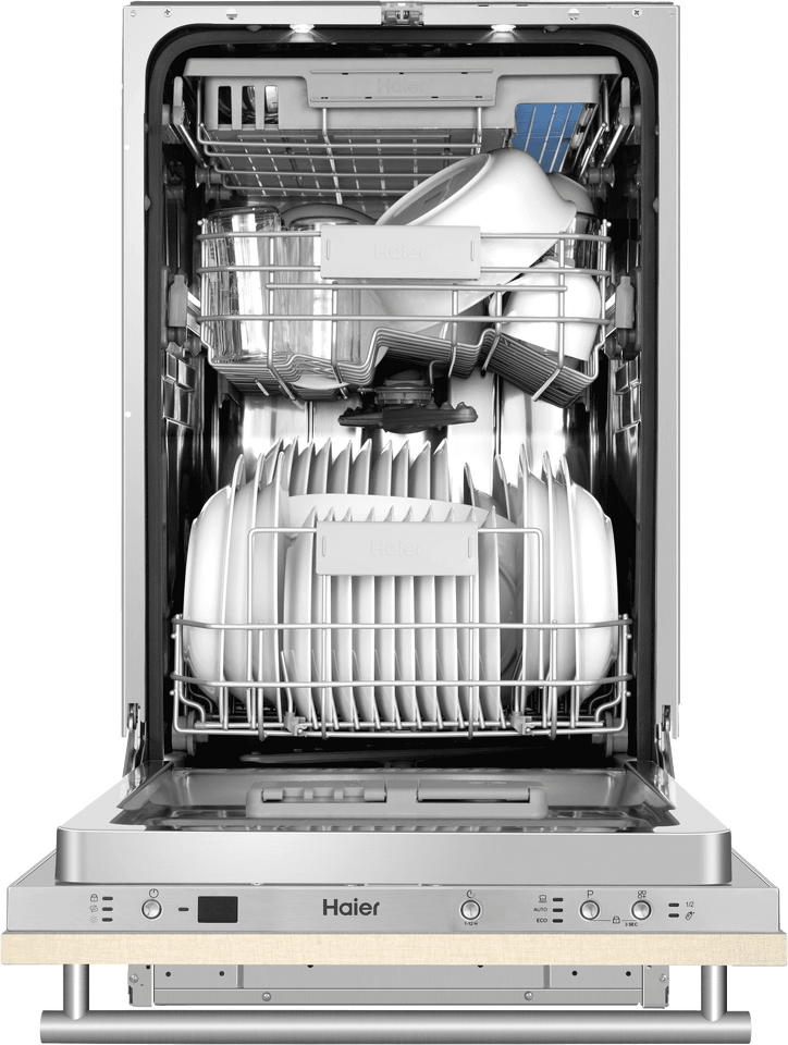 Haier DW10-198BT3RU — узкая встраиваемая посудомоечная машина, которая избавит от необходимости мыть посуду вручную и сэкономит место на кухне. Ширина модели — 45 см, вместо стандартных 60 см. При этом она большой вместимости — до 10 комплектов посуды. За раз можно помыть сразу много — это оценят большие семьи и те, кто любит готовить или часто принимает гостей. В машине максимально эффективно организовано внутреннее пространство. Есть удобная выдвижная верхняя корзина для столовых приборов и мелкой утвари. Средняя корзина — с изменяемой высотой установки, чтобы можно было мыть посуду разного размера и объёмов. В корзинах есть складные держатели для посуды — дополнительное важное удобство. Есть подсветка в рабочей камере — даже мелкие предметы не останутся незамеченными. Предусмотрены несколько программ мытья для посуды разного типа и степени загрязнения. Среди них автоматическая — машина оптимизирует цикл мытья, в зависимости от загрузки и степени загрязнения посуды. Благодаря световой индикации — технология «луч на полу» — всегда понятно на каком этапе цикл мытья, закончился он или нет. Посудомоечная машина Haier DW10-198BT3RU — помоет посуду без вашего участия, освобождая время для более приятных занятий.