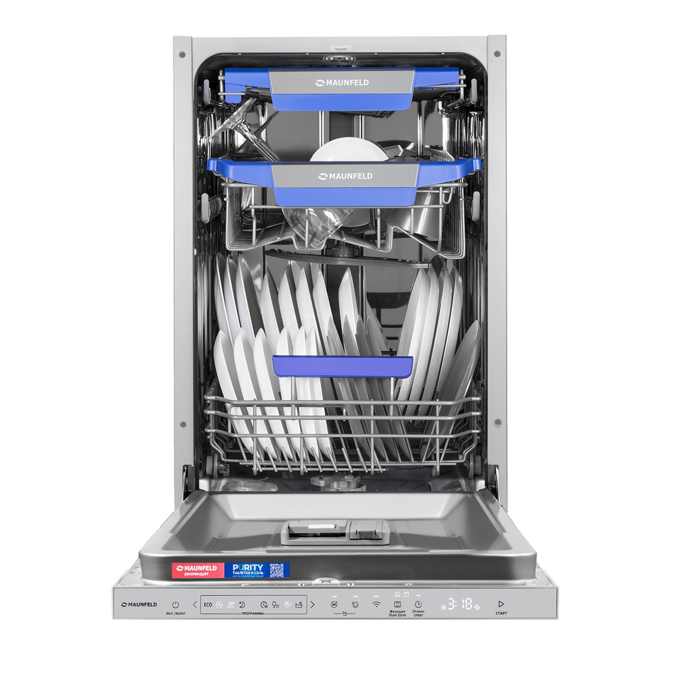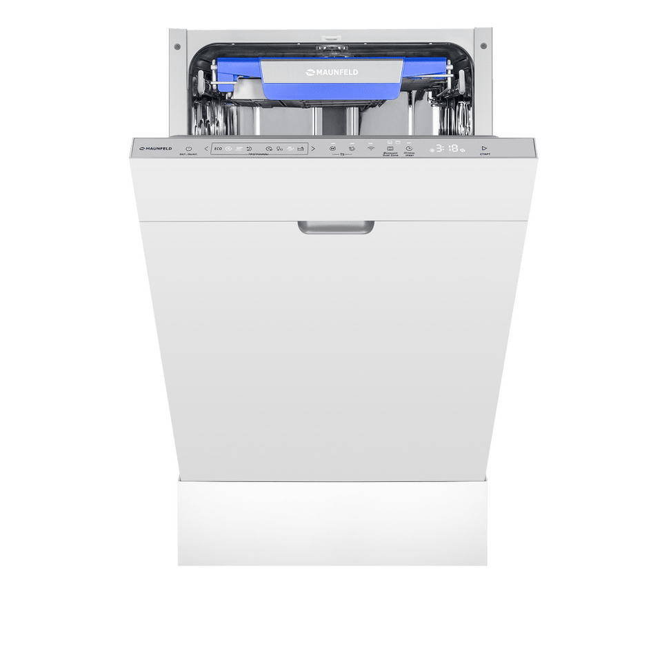 MAUNFELD MLP45330T Smart Beam Inverter Wi-Fi— это узкая модель, шириной 45 см (вместо классических 60 см), но весьма вместительная. За раз она может вымыть сразу много посуды, до 10 комплектов — это оценят в больших семьях, а также те, кто любит готовить, часто принимает гостей.