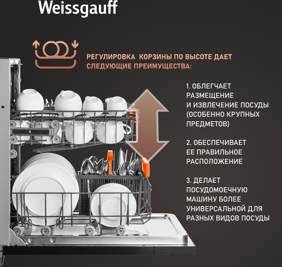До 9 комплектов посуды одновременно вы можете расположить в данной посудомоечной машине, благодаря современным продуманным и эргономичным корзинам, которыми Weissgauff оснастили эту модель!
