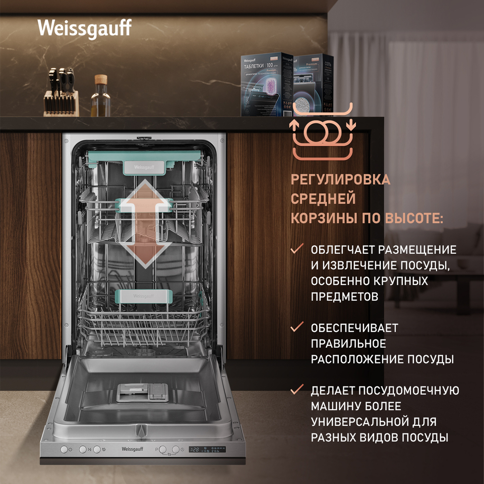 Вертикальная регулировка средней корзины по высоте, как в загруженном, так и в пустом состоянии, позволит вам буквально на лету изменять внутреннее пространство посудомоечной машины, размещая посуду наиболее эргономичным образом.