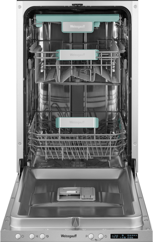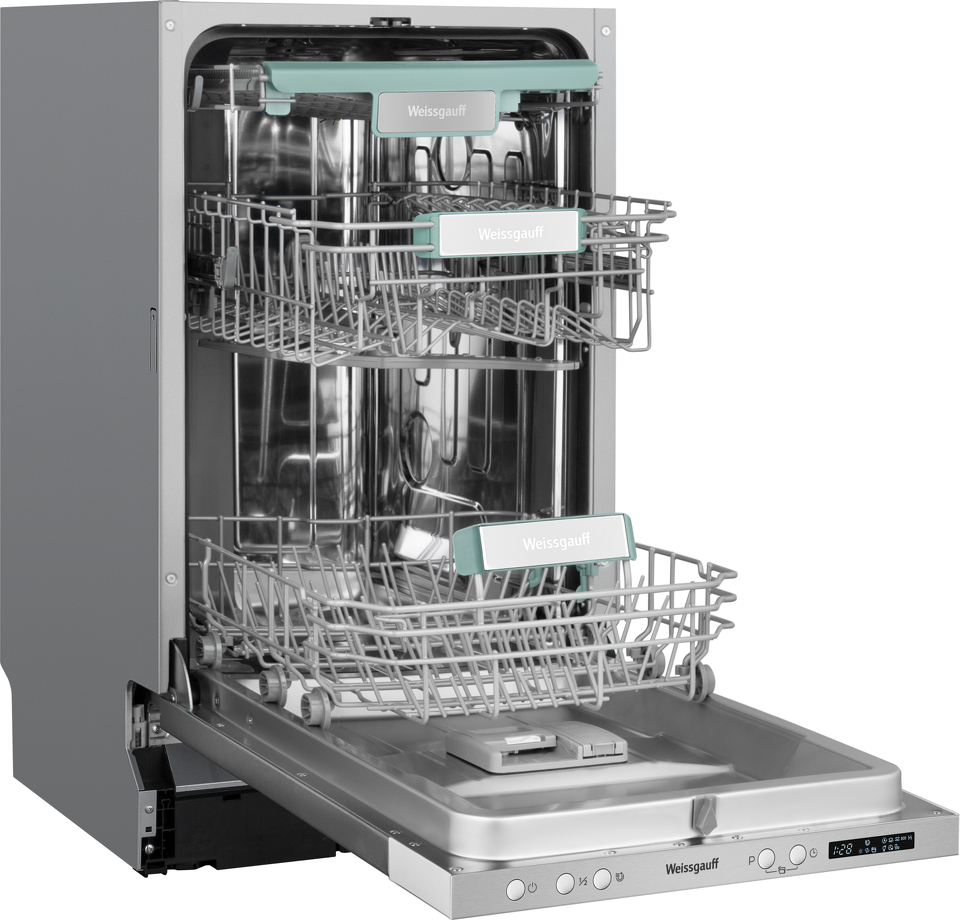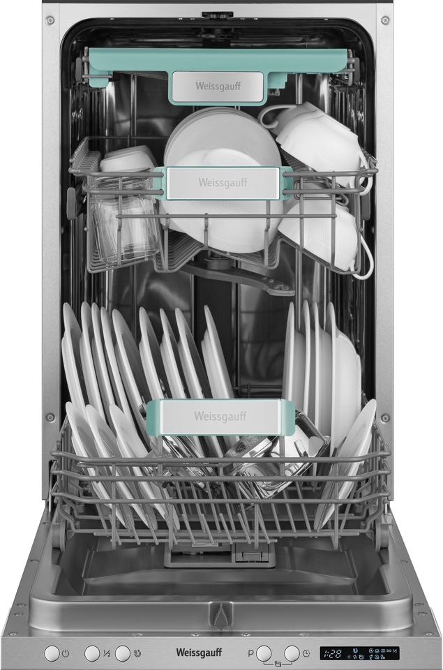 До 10 комплектов посуды одновременно вы можете расположить в данной посудомоечной машине, благодаря современным продуманным и эргономичным корзинам, которыми Weissgauff оснастили эту модель