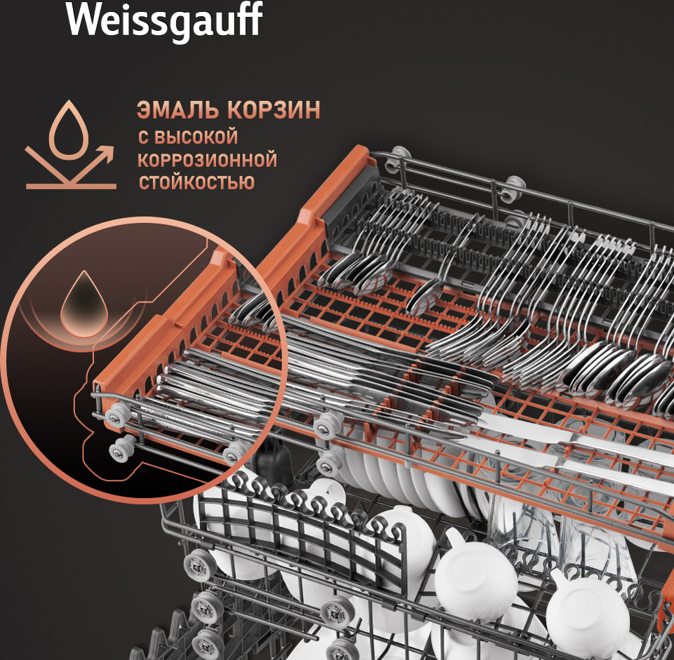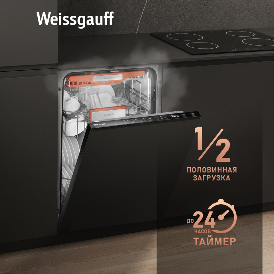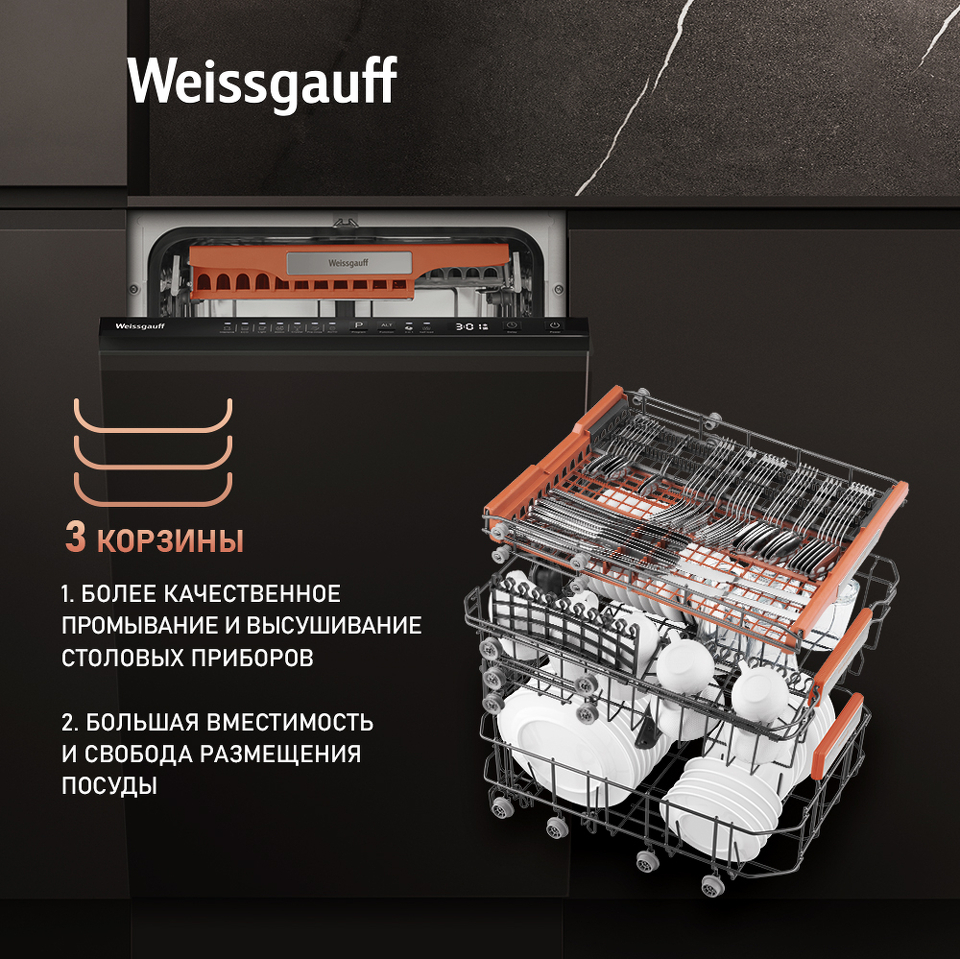 До 11 комплектов посуды одновременно вы можете расположить в данной посудомоечной машине, благодаря современным продуманным и эргономичным корзинам, которыми Weissgauff оснастили эту модель!