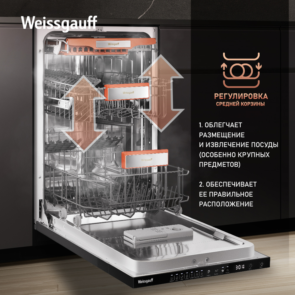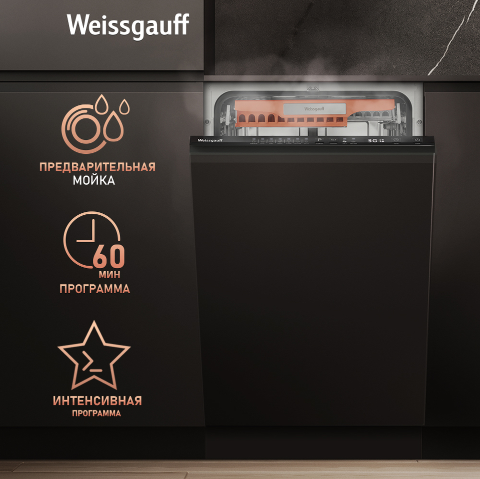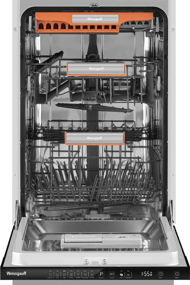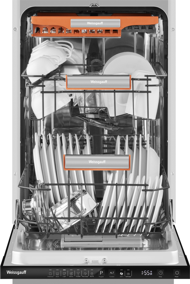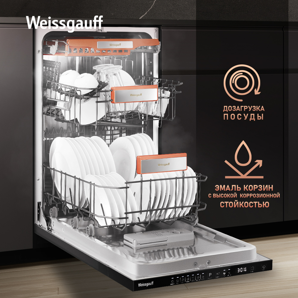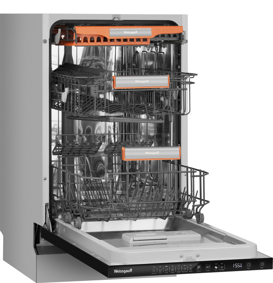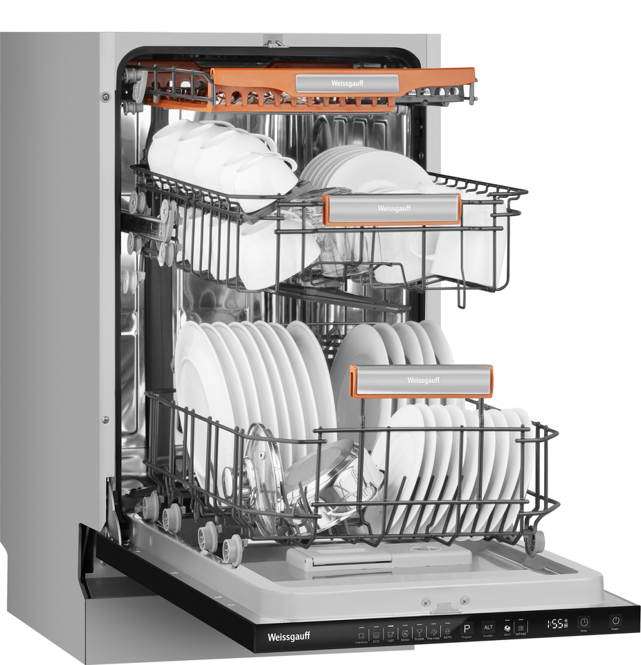 Weissgauff представляет вашему вниманию новую модель встраиваемой посудомоечной машины шириной 45 см, оснащенную 3 корзинами и обладающую вместимостью до 11 комплектов посуды, а также функциональным набором из 7 программ, позволит подобрать оптимальный режим в зависимости от количества посуды и степени загрязнения.