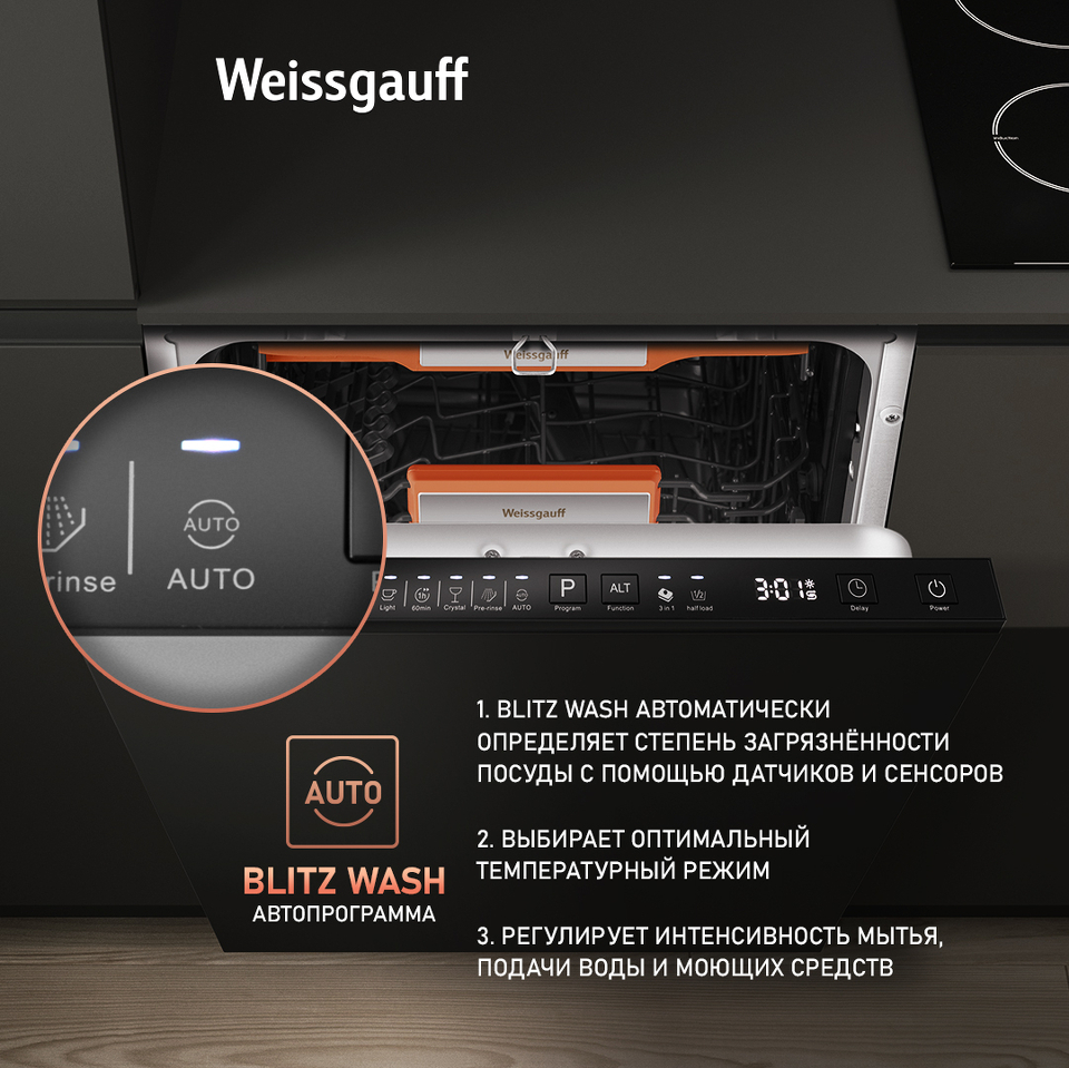 Автопрограмма Blitz Wash - просто выберите авторежим, и посудомоечная машина, с помощью датчиков и сенсоров самостоятельно определит степень загрязненности вашей посуды и выберет оптимальный температурный режим и интенсивность мытья!