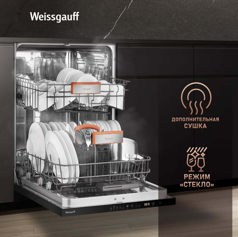 До 12 комплектов посуды одновременно вы можете расположить в данной посудомоечной машине, благодаря современным продуманным и эргономичным корзинам, которыми Weissgauff оснастили эту модель!