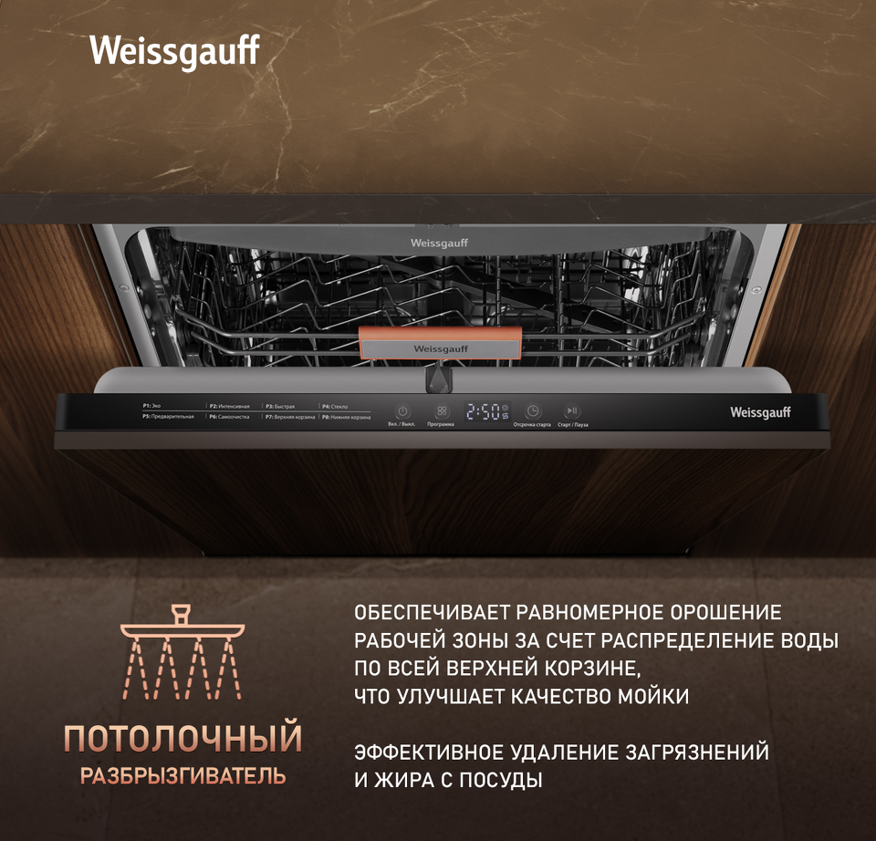 • До 14 комплектов посуды одновременно вы можете расположить в данной посудомоечной машине, благодаря современным продуманным и эргономичным корзинам, которыми Weissgauff оснастили эту модель!