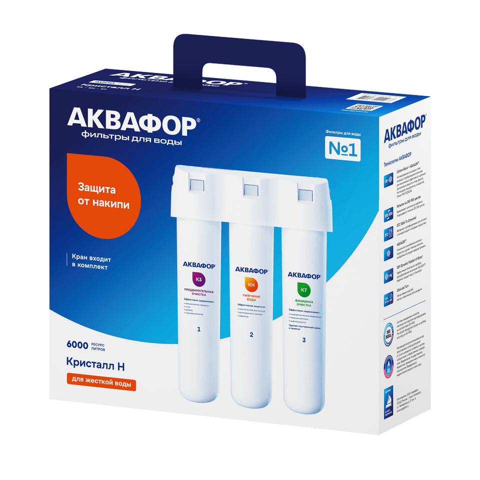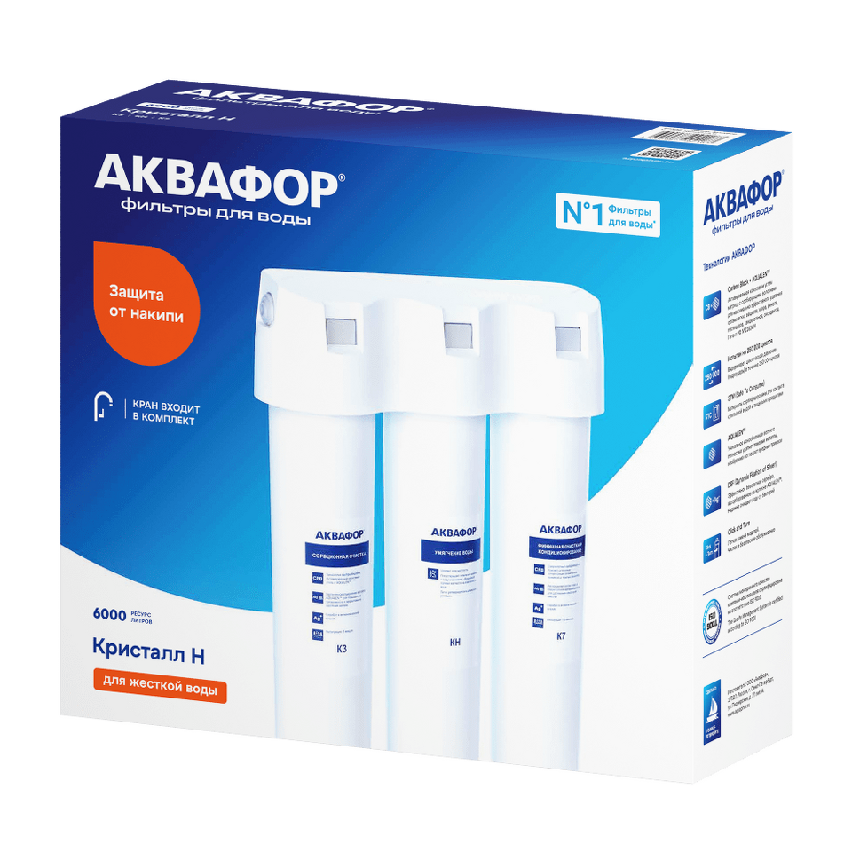 АКВАФОР Кристалл H удаляет хлор, тяжелые металлы, пестициды, нефтепродукты и другие распространенные токсины и аллергены, сохраняя минеральный состав воды.