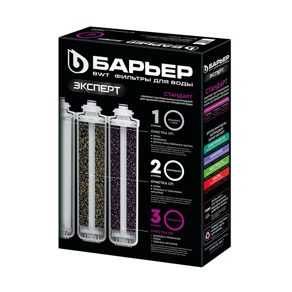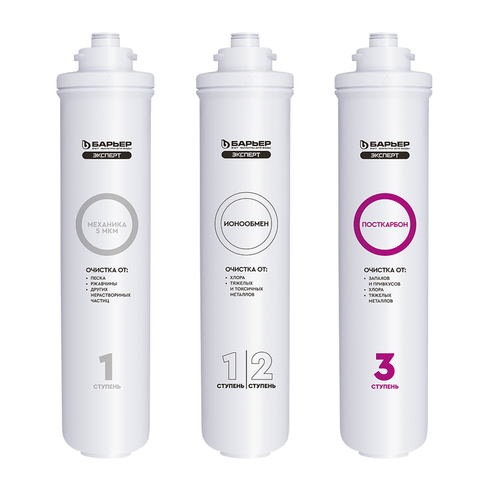 3."БАРЬЕР ЭКСПЕРТ ПостКарбон" - финишная очистка и кондиционирование, устранение неприятных привкусов и остаточного хлора.