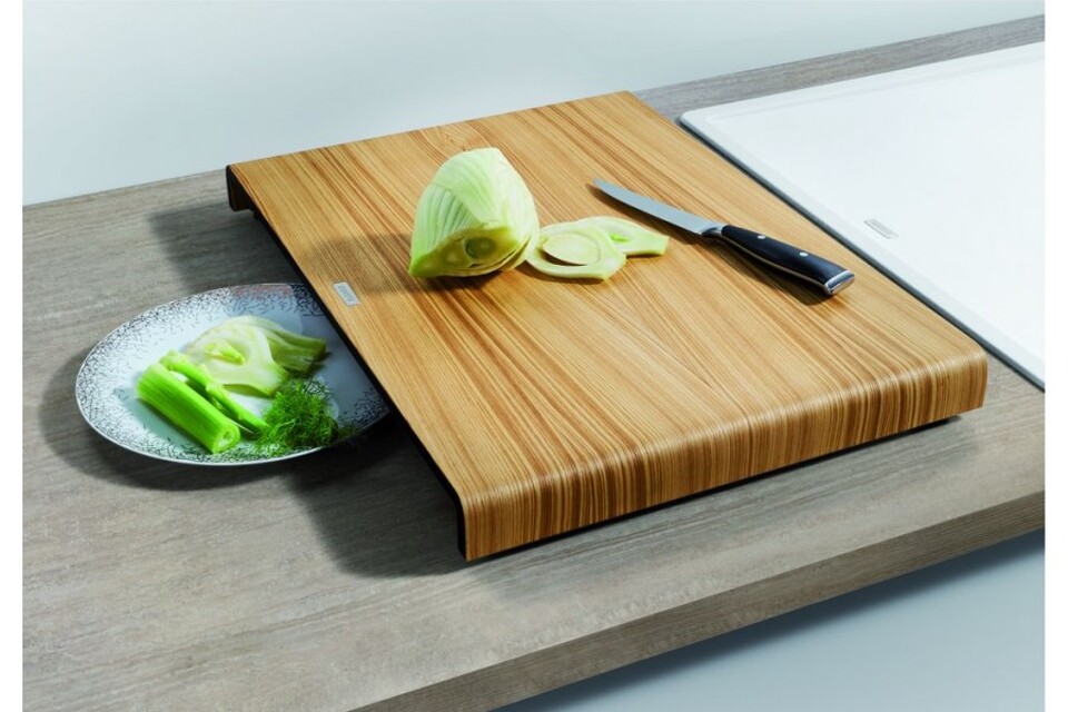 Стеклянная разделочная доска скользит по поверхности мойки, нарезанные продукты можно сбрасывать в посуду или многофункциональный коландер, находящеся в мойке.