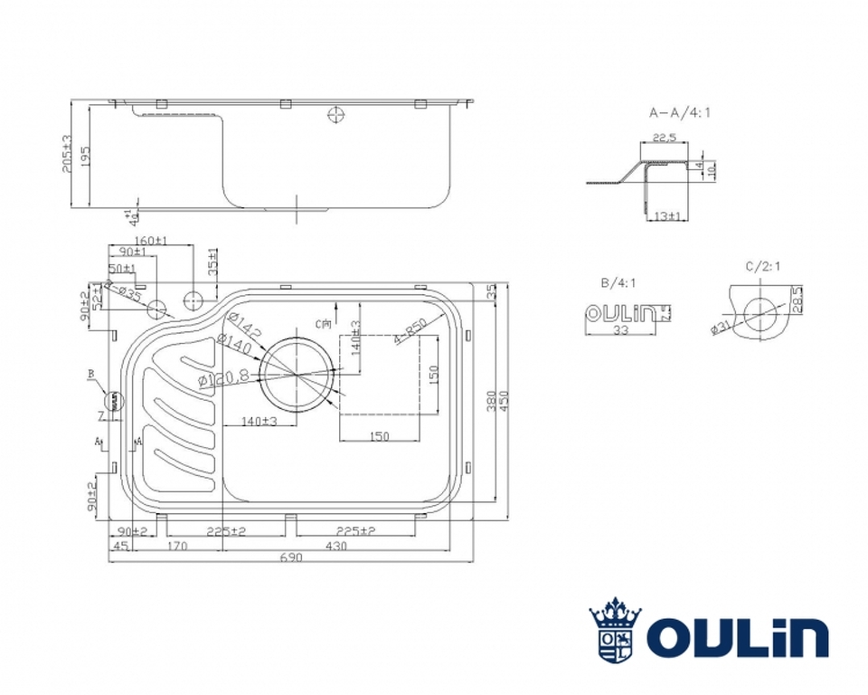 OULIN OL-327R оригинальная мойка для кухни с удобным крылом. Тип исполнения мойки - моноблок. Мойка - врезная.
