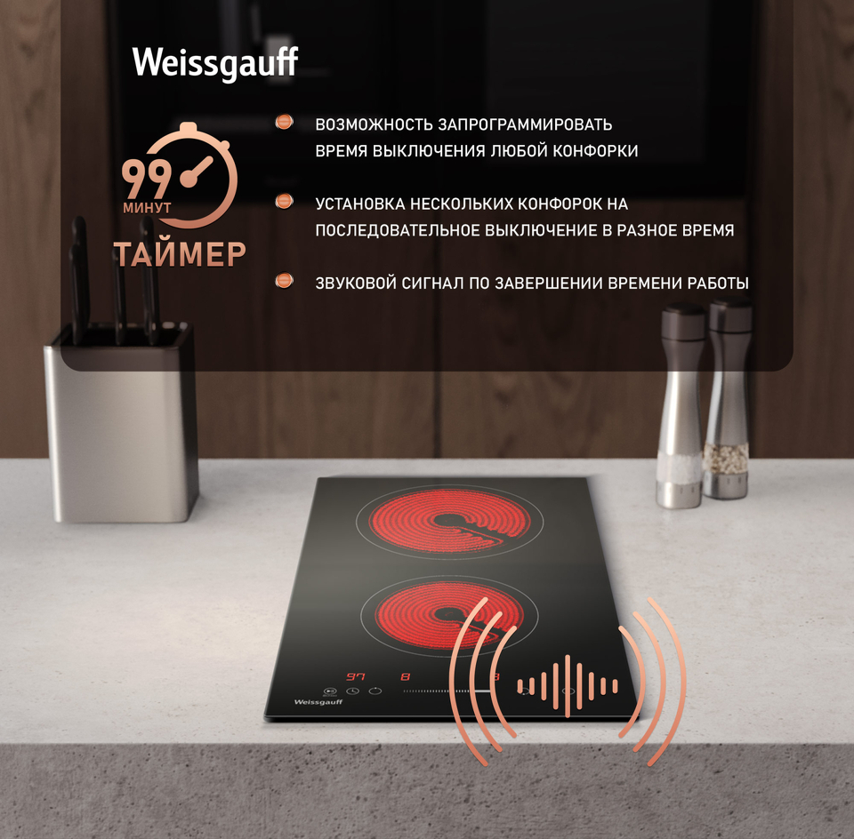 Таймер до 99 минут дает вам возможность запрограммировать время выключения любой конфорки, с точностью до минуты