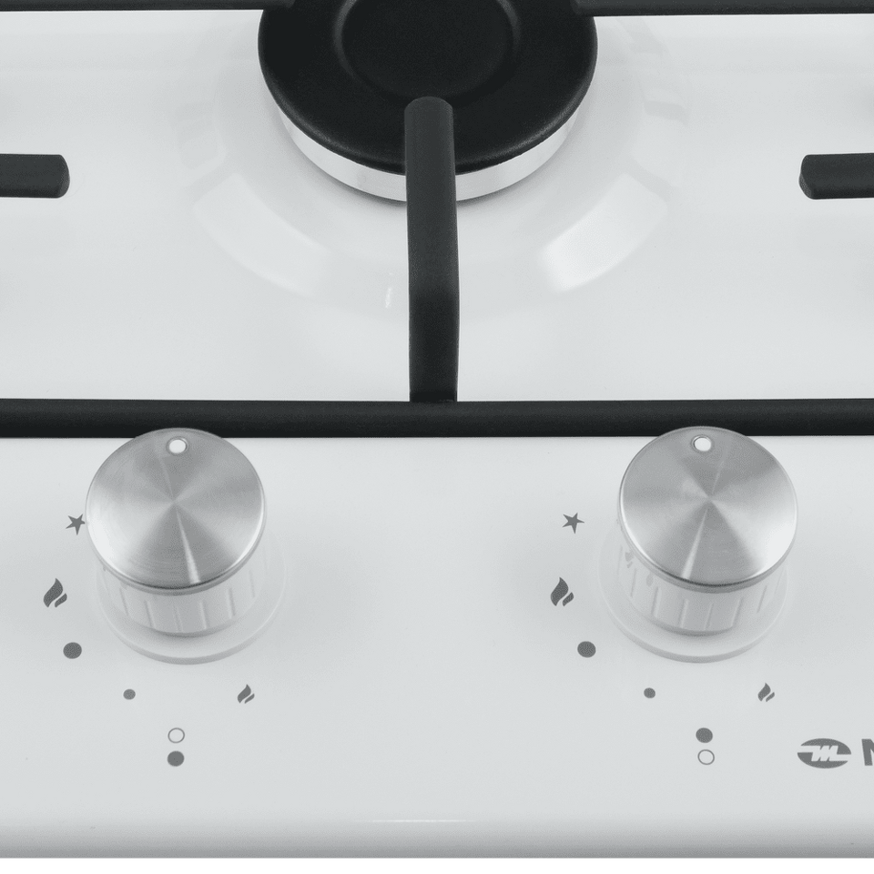 Управление подачи газа и электроподжиг конфорок происходит с помощью поворотных регуляторов. Для простоты использования около каждой ручки нанесены информационные изображения: используемая конфорка, подача газа выключена, электроподжиг, максимальное пламя и минимальное пламя.