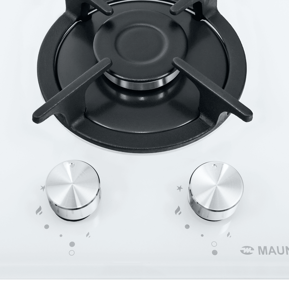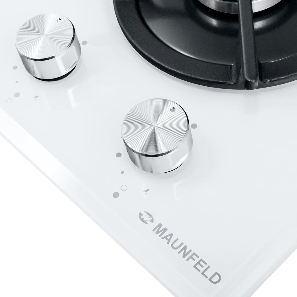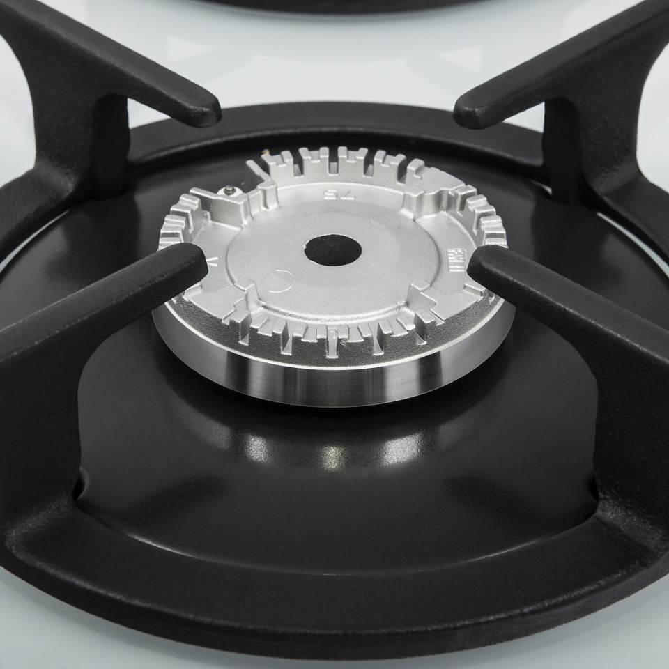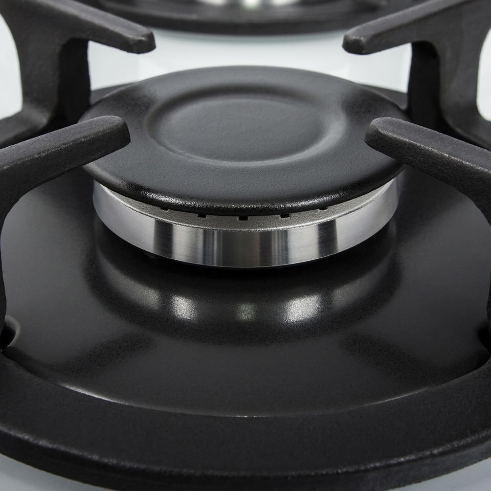 Панель выполнена из термостойкого белого стекла толщиной 8 мм с фацетом по всему периметру. В данной модели установлены высококачественные итальянские горелки SABAF. Две конфорки разного диаметра с мощностью 1700 Вт и 2600 Вт укомплектованы сферическими чугунными решетками.