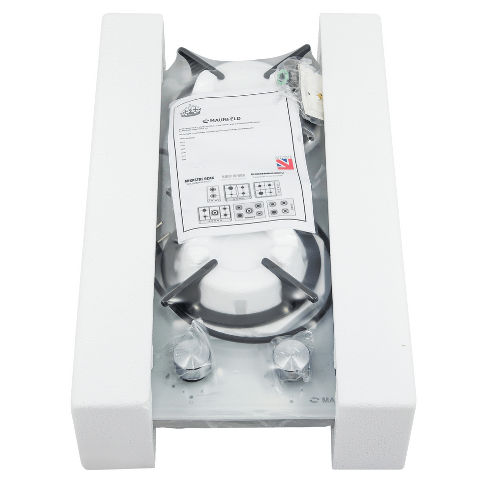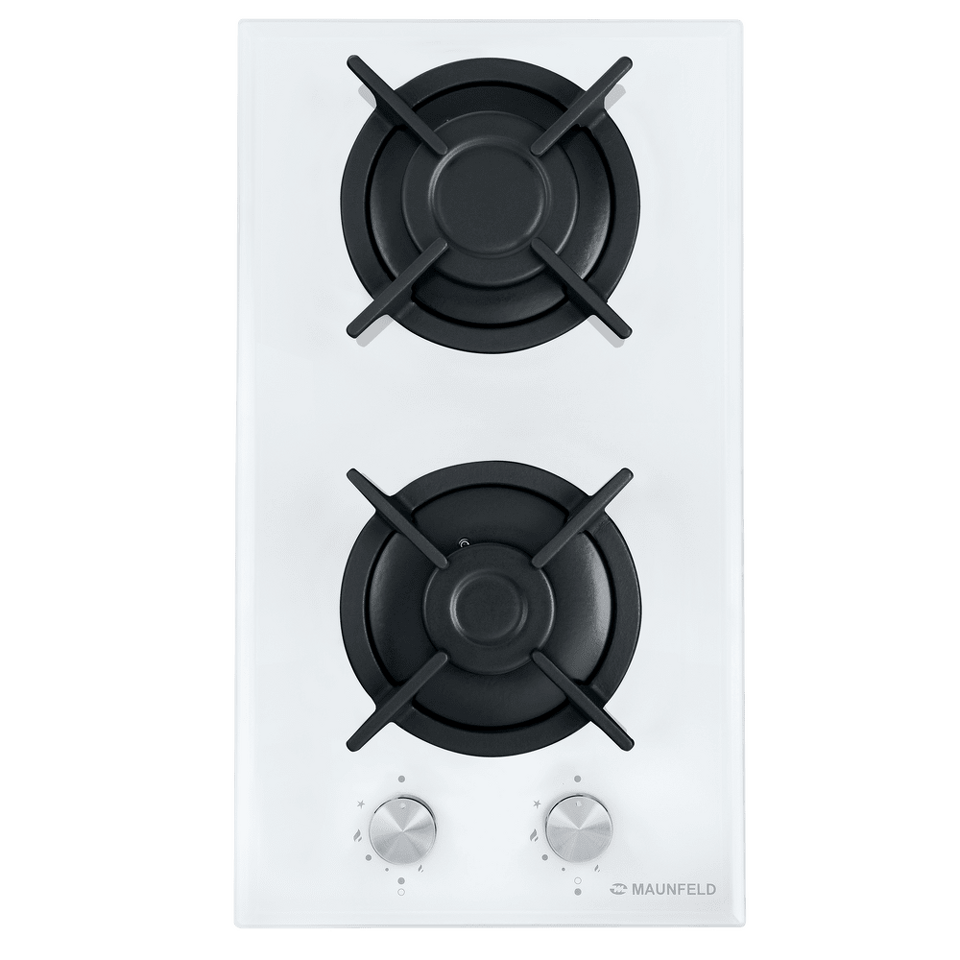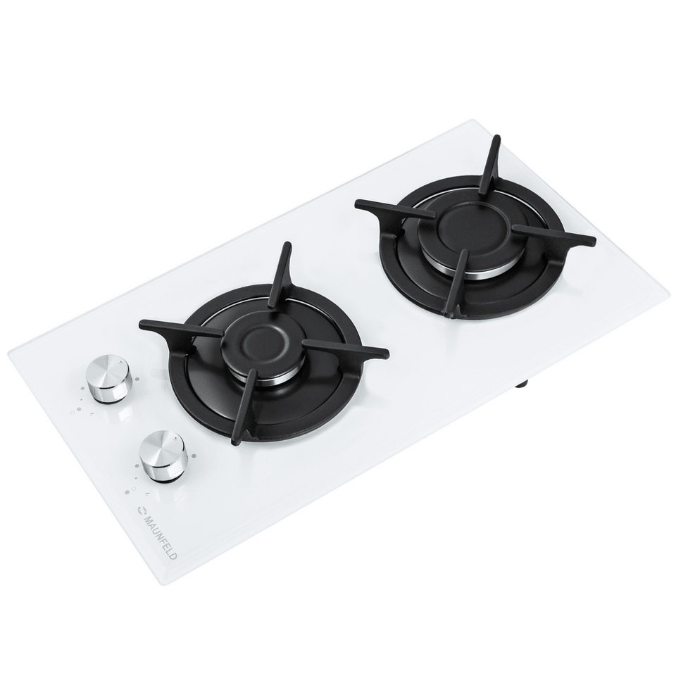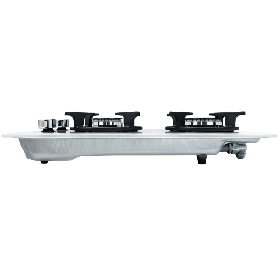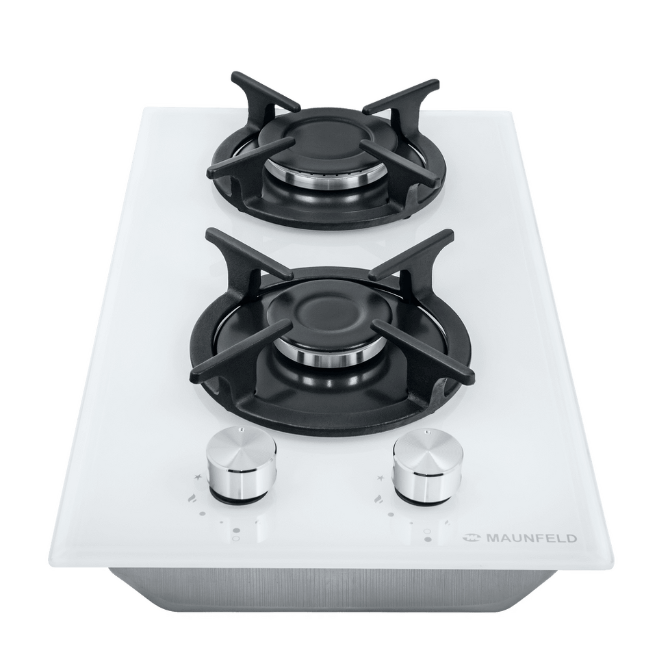 Панель выполнена из термостойкого белого стекла толщиной 8 мм с фацетом по всему периметру. В данной модели установлены высококачественные итальянские горелки SABAF. Две конфорки разного диаметра с мощностью 1700 Вт и 2600 Вт укомплектованы сферическими чугунными решетками.
