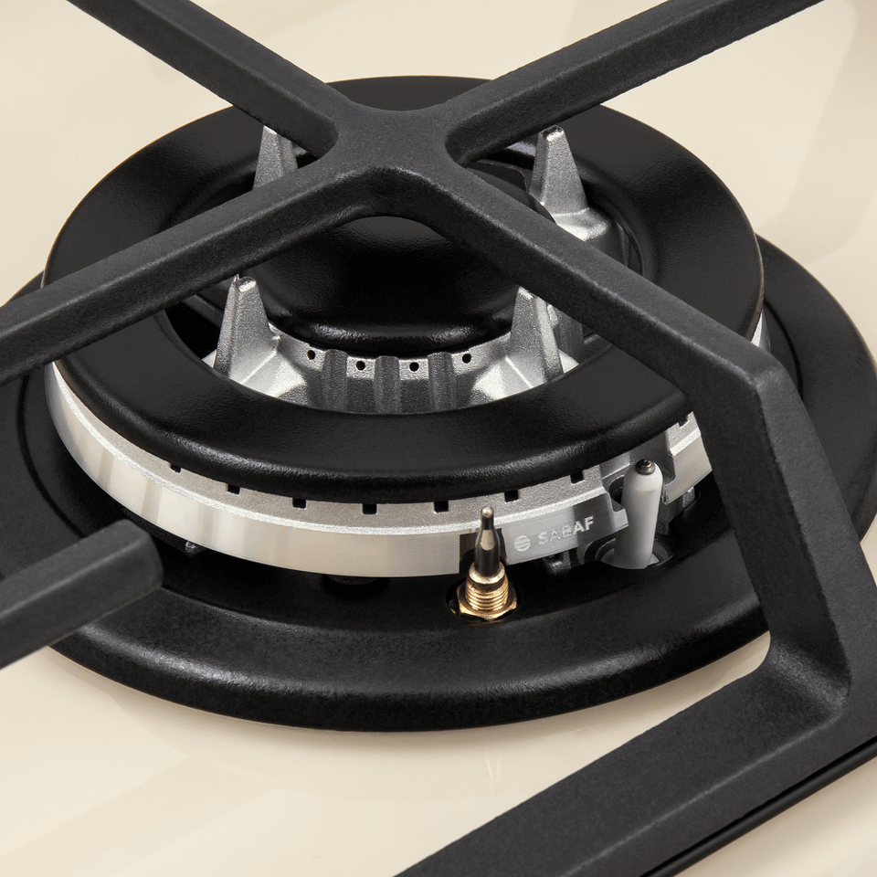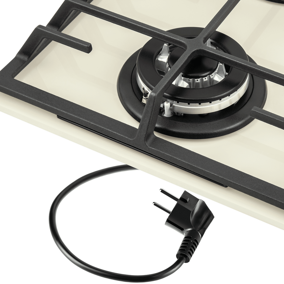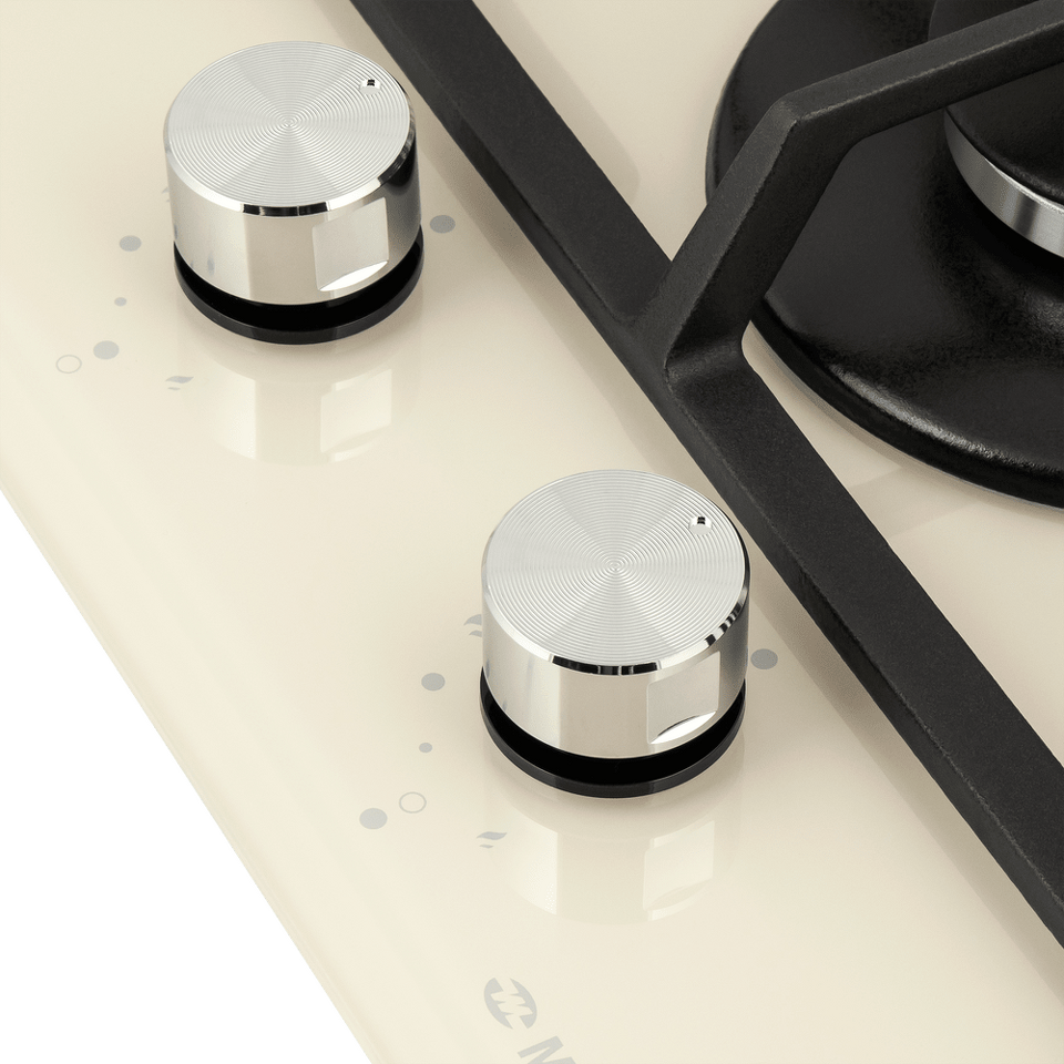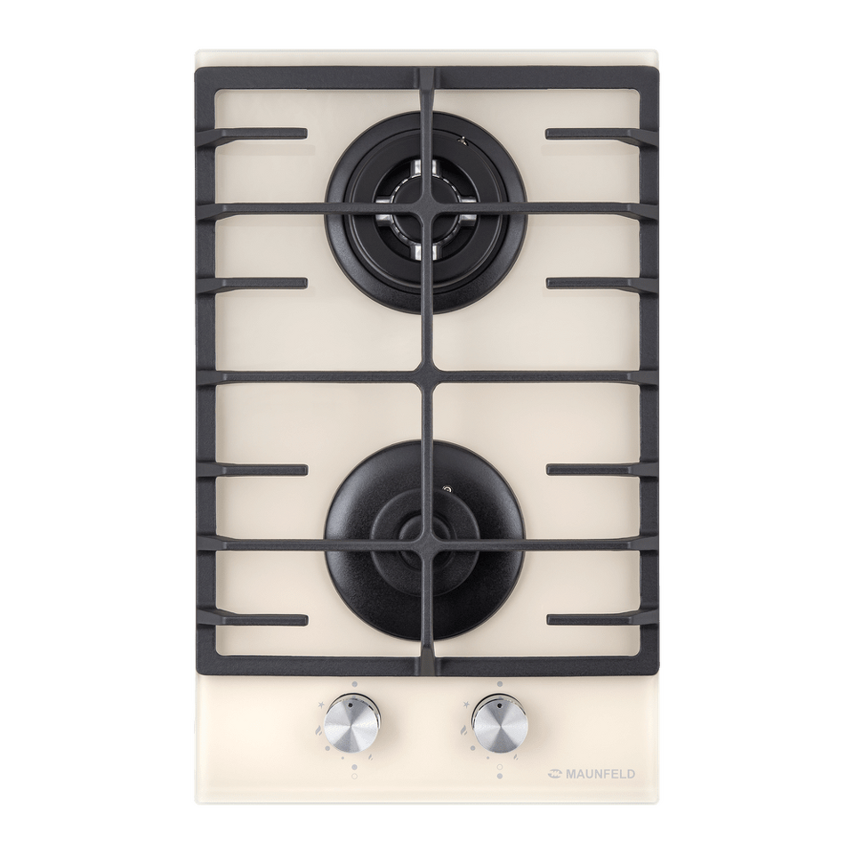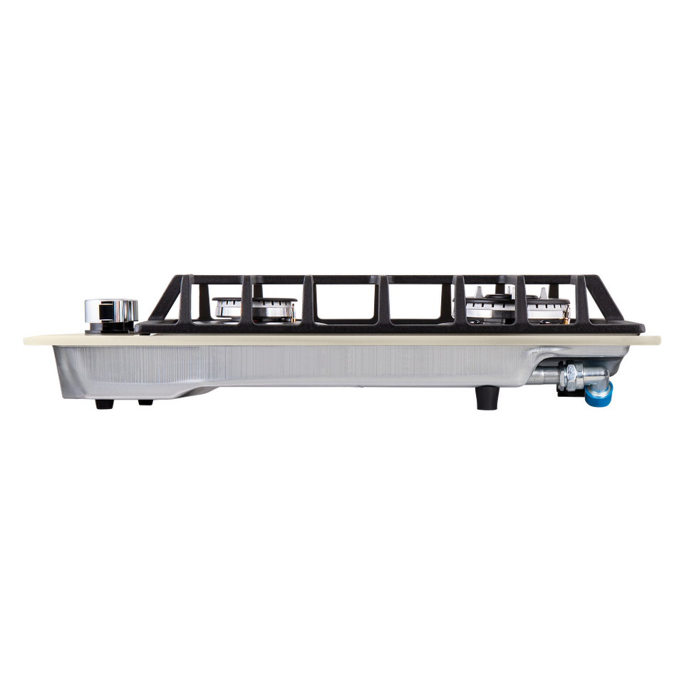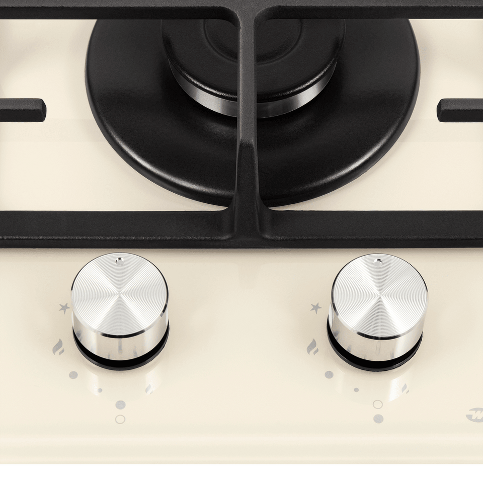 Панель бежевого цвета выполнена из закаленного стекла толщиной 8 мм от немецкого производителя Schott. В данной модели установлены высококачественные итальянские горелки «Sabaf». Одна стандартная конфорка  мощностью 1700 Вт и одна WOK-конфорка с двойным пламенем  мощностью 3000 Вт.